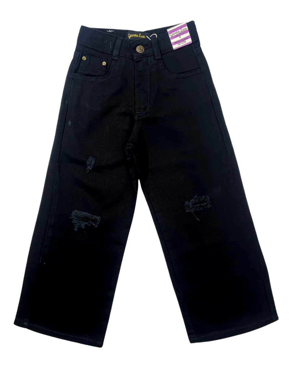 Calça feminina, Garota Lua, preta, modelo Wide Leg, detalhes desfiados para ficar ainda mais linda, com ajuste no cós.