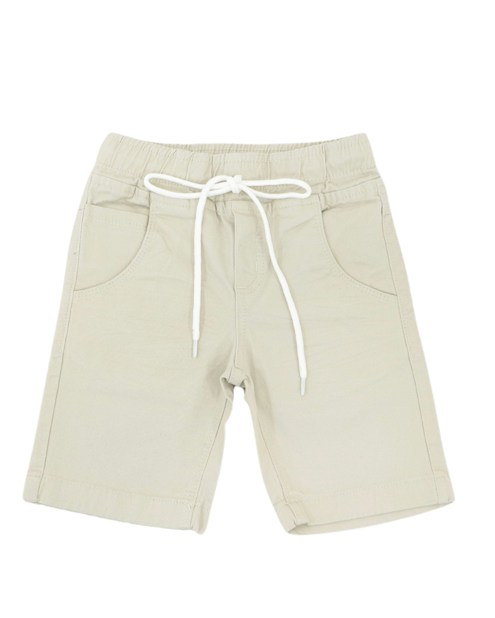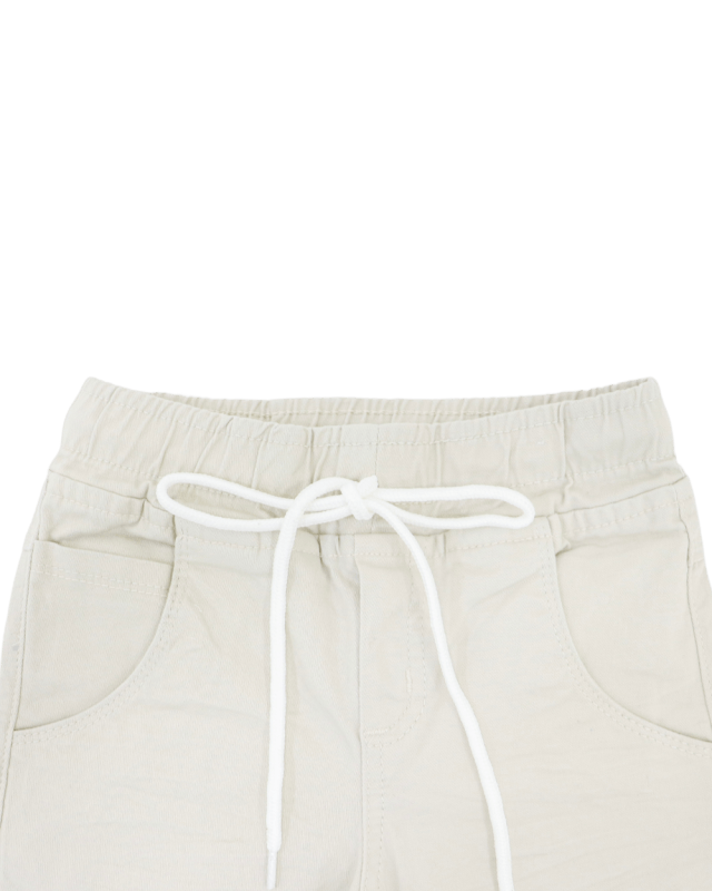 Modelo bege com bolsos e barra em acabamento simples.