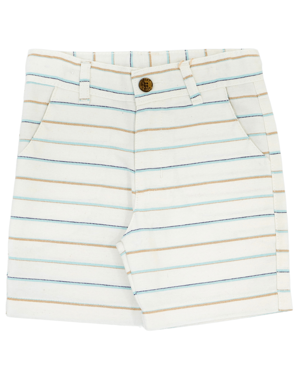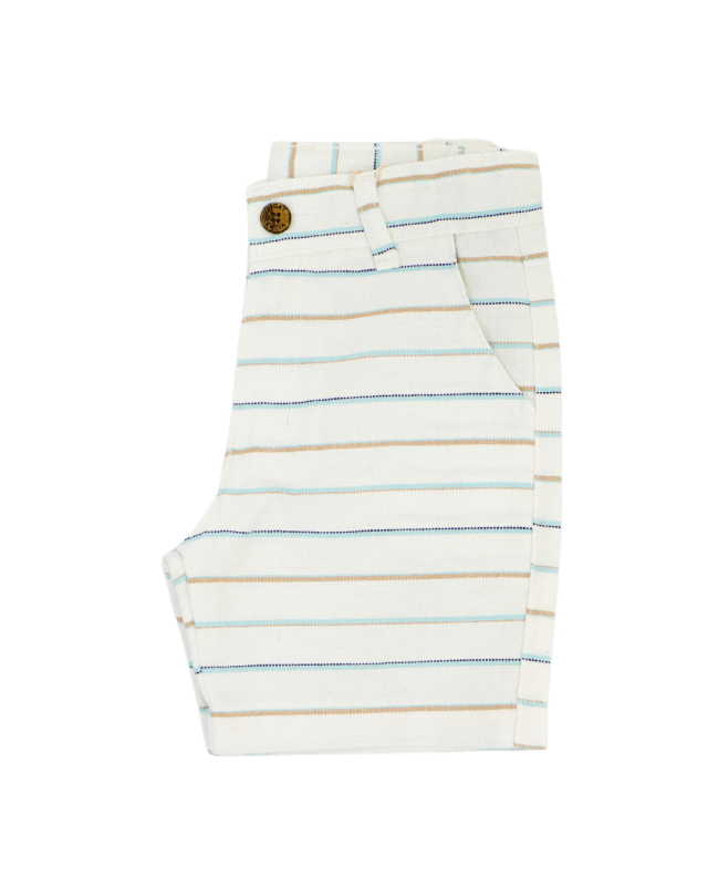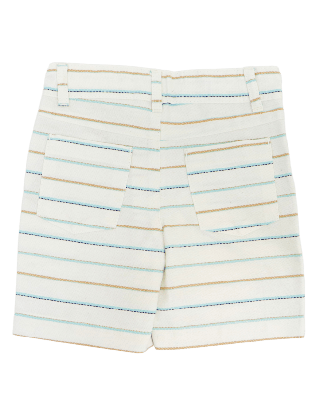 Bermuda listrada vigat linho, com barra simples, passante para cinto ajuste no cós, bolso faca e bolsos traseiros.