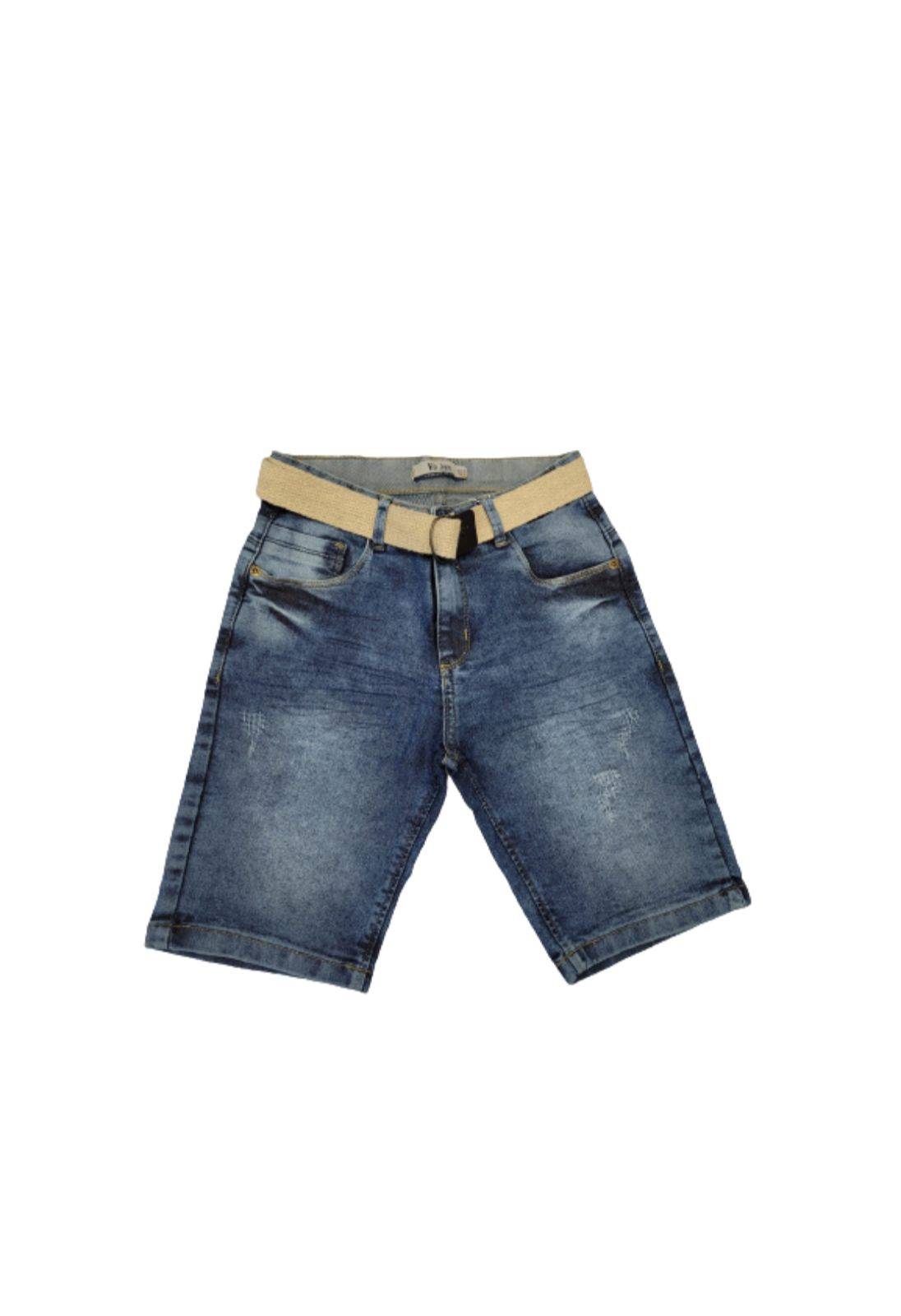 Bermuda jeans masculina juvenil, com bolsos frontal e traseiro, fecho por botão e zíper. Cós com regulagem e passante para cinto.