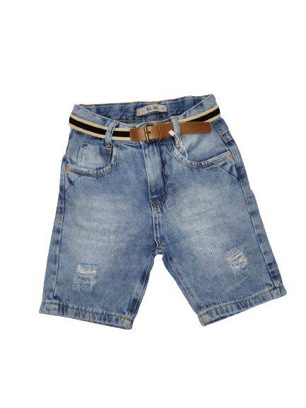 Bermuda jeans masculina juvenil, com bolsos frontal e traseiro, fecho por botão e zíper. Cós com regulagem e passante para cinto.