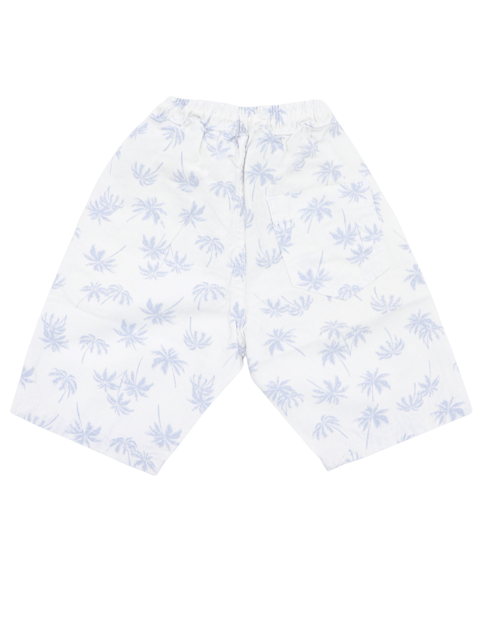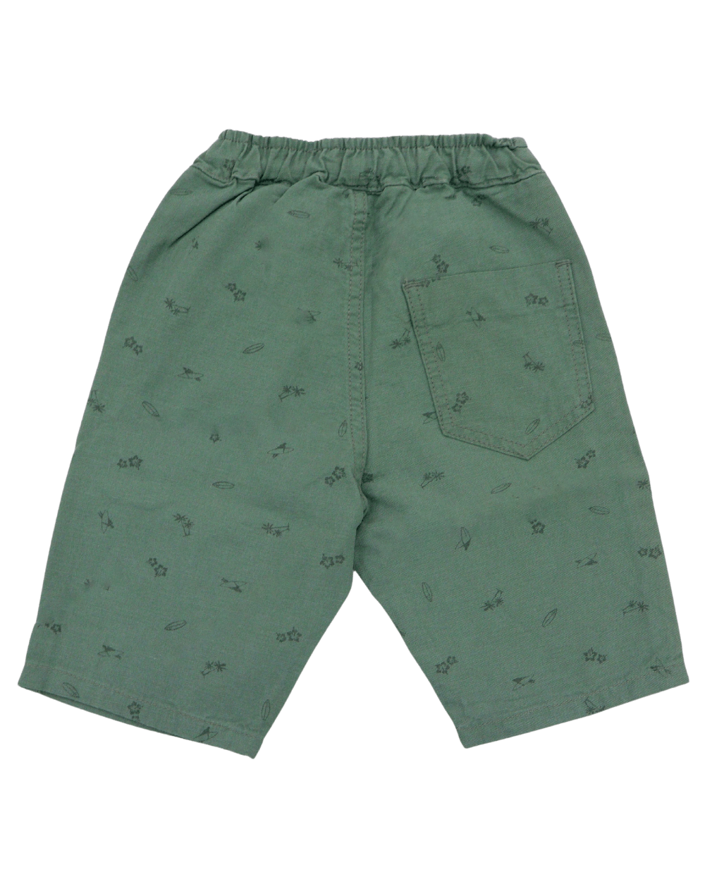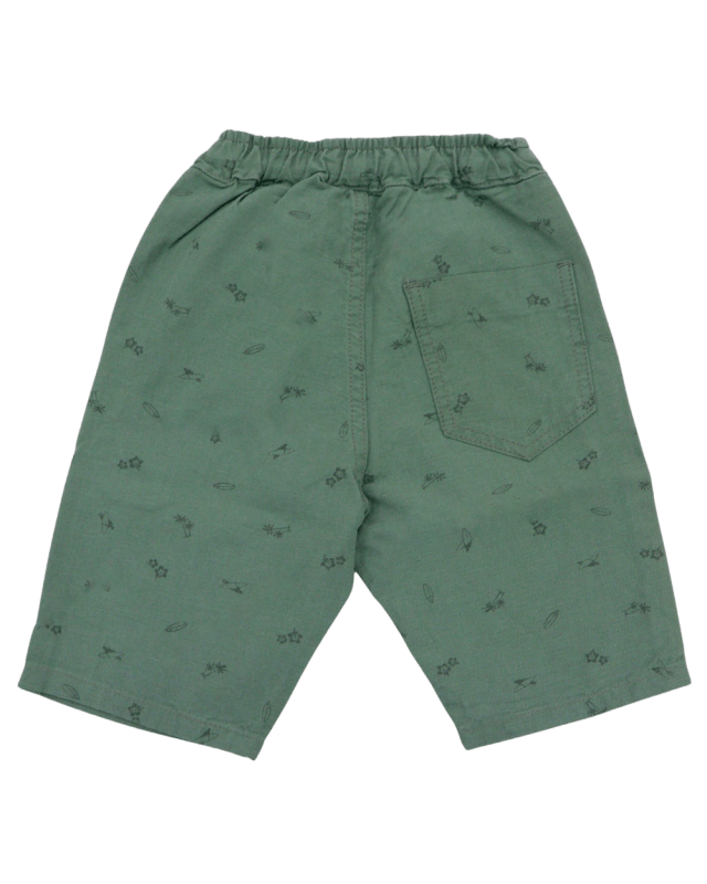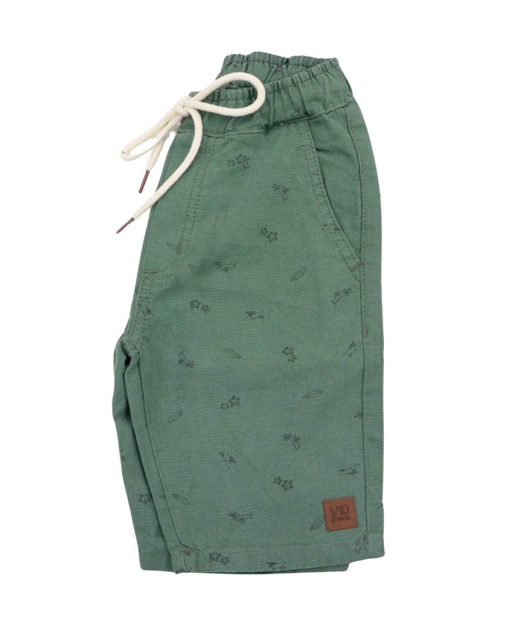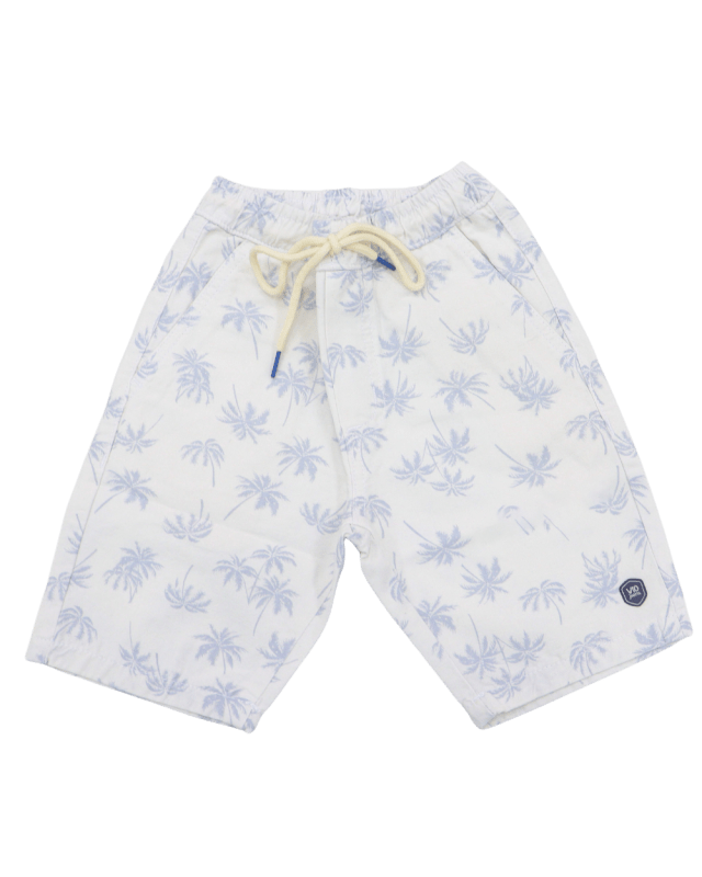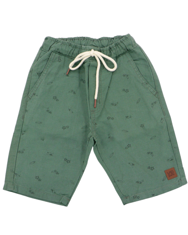 Bermuda em sarja estampada V10, modelo com cintura elástica, bolsos, barra em acabamento simples.