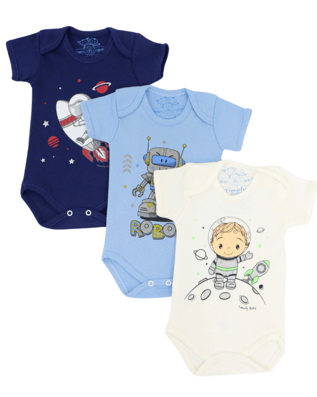 Kit de Body manga curta,Timufy com 3 peças, modelinho em suedine, liso, estampado com fechamento por botões entre as pernas.
