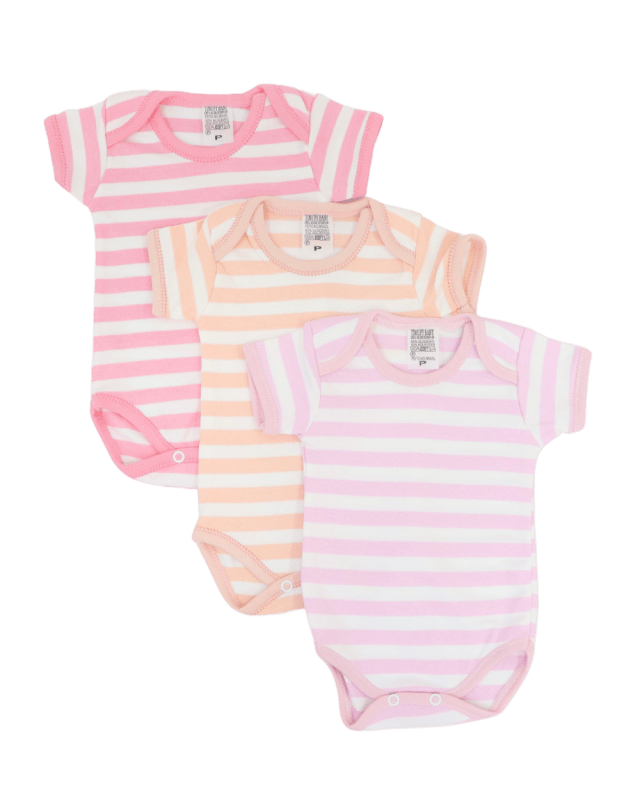 Kit de Body manga curta, Timufy com 3 peças, modelinho em suedine, liso, estampado em listras com fechamento por botões.