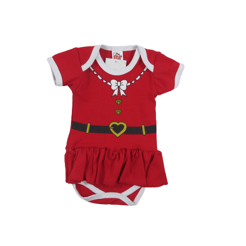 Body manga curta estampado mamãe noel, com babados, fechamento entre as pernas.