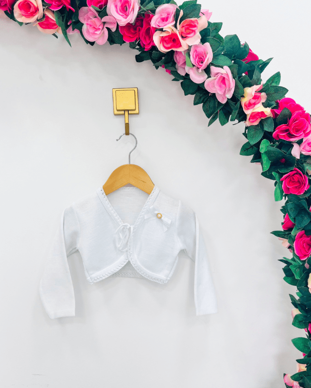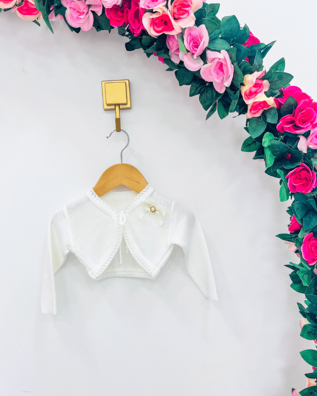 Bolero infantil , manga longa linho, com aplicação de laço, com strass. Ideal para os dias mais friozinhos.