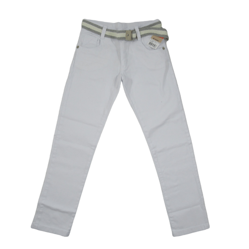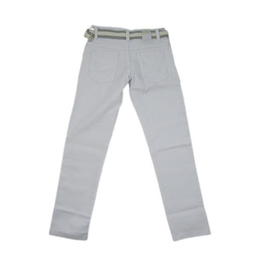Calça branca masculina ,com bolsos frontal e traseiro, fecho por botão e zíper, cós com regulagem e passante para cinto.