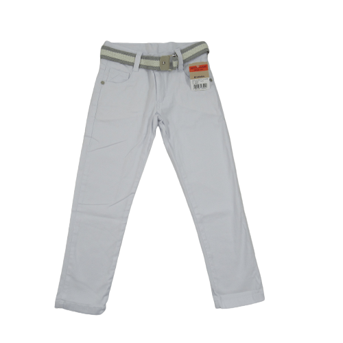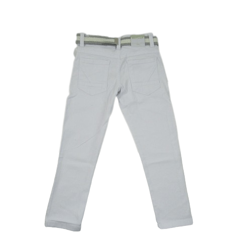 Calça branca masculina ,com bolsos frontal e traseiro, fecho por botão e zíper, cós com regulagem e passante para cinto.