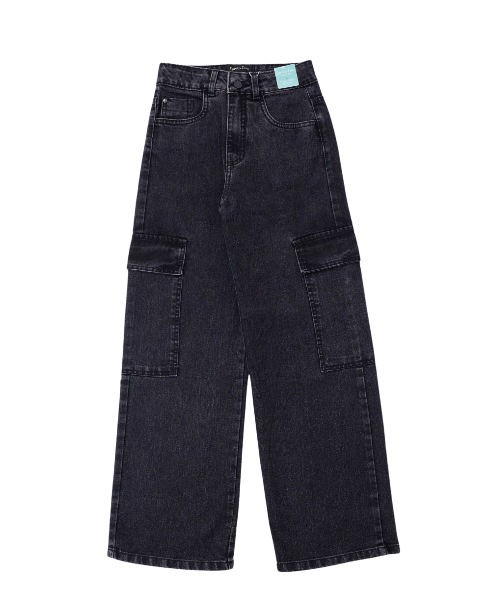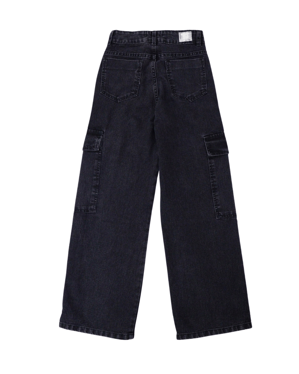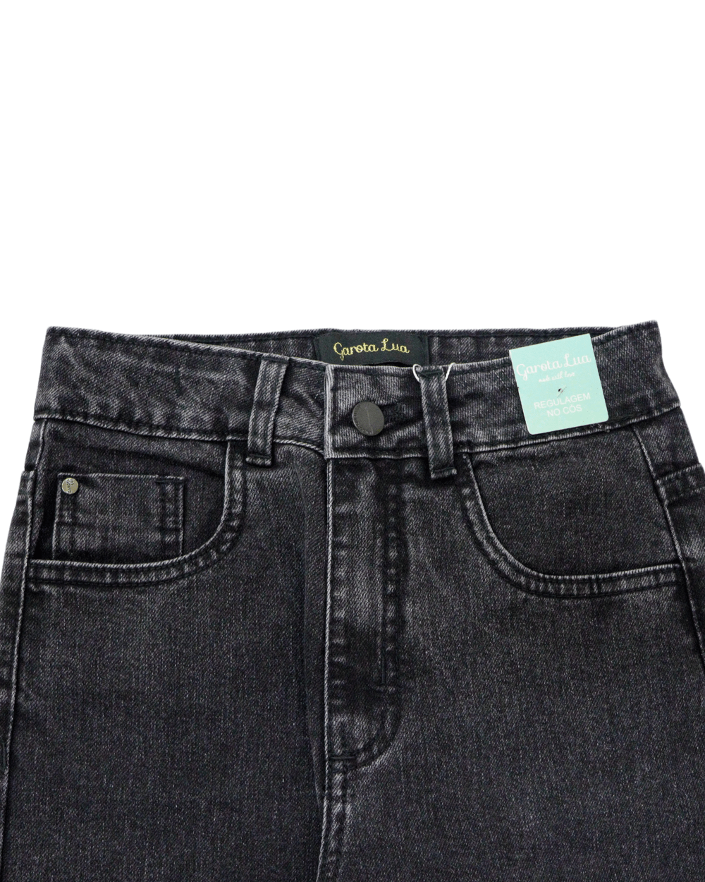 Calça Feminina, GAROTA LUA, Wide Leg, lisa com lavagem média regulagem no cós bolsos laterais e barra simples.