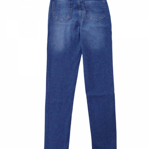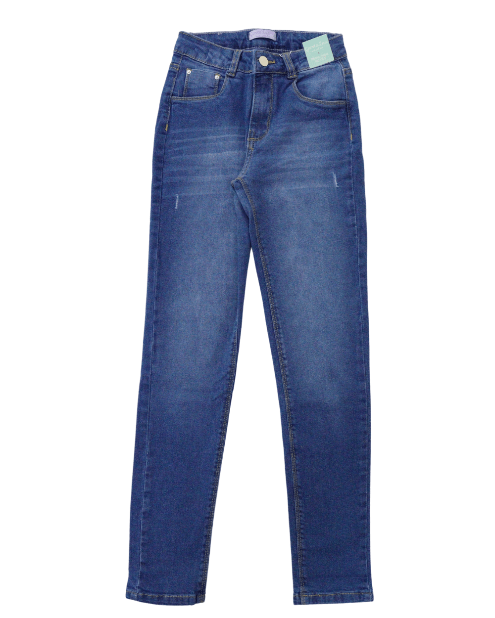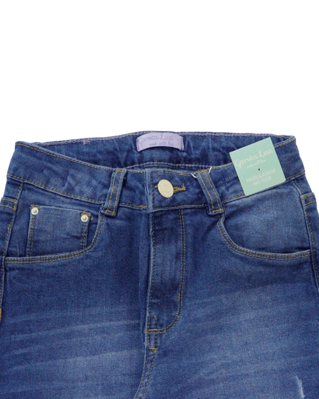 Calça Feminina, garota lua, lisa com lavagem média regulagem no cós e barra simples.