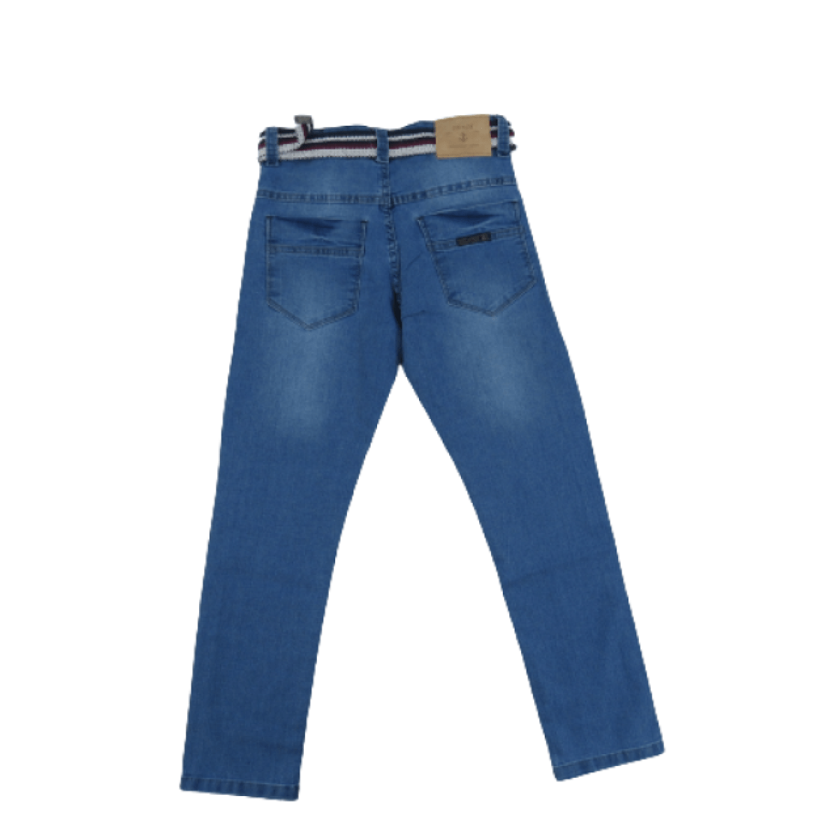 Calça jeans masculina infantil, lavagem clara, bolso frontal e bolso traseiro ,cós com regulagem, Barra com acabamento simples. Acompanha 1 cinto. Cor: Lavagem clara Composição:80% Algodão 18%Poliéster 2% Elastano