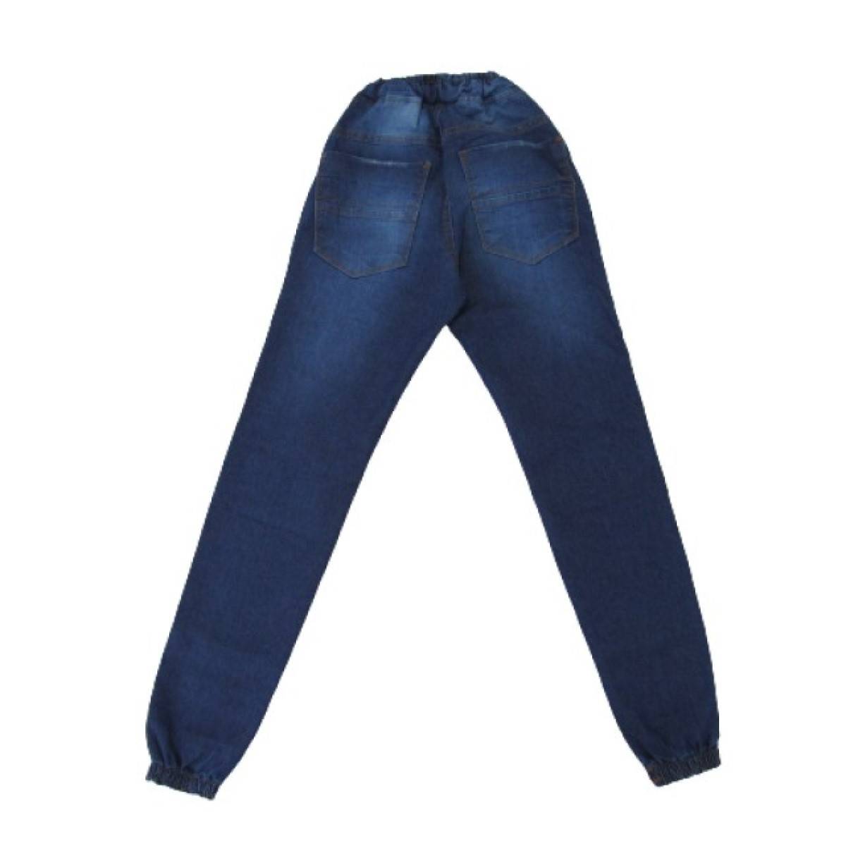 Calça jeans jogger masculina infantil, lavagem escura, bolso frontal e bolso traseiro ,cós com elástico , Barra com punho elástico.