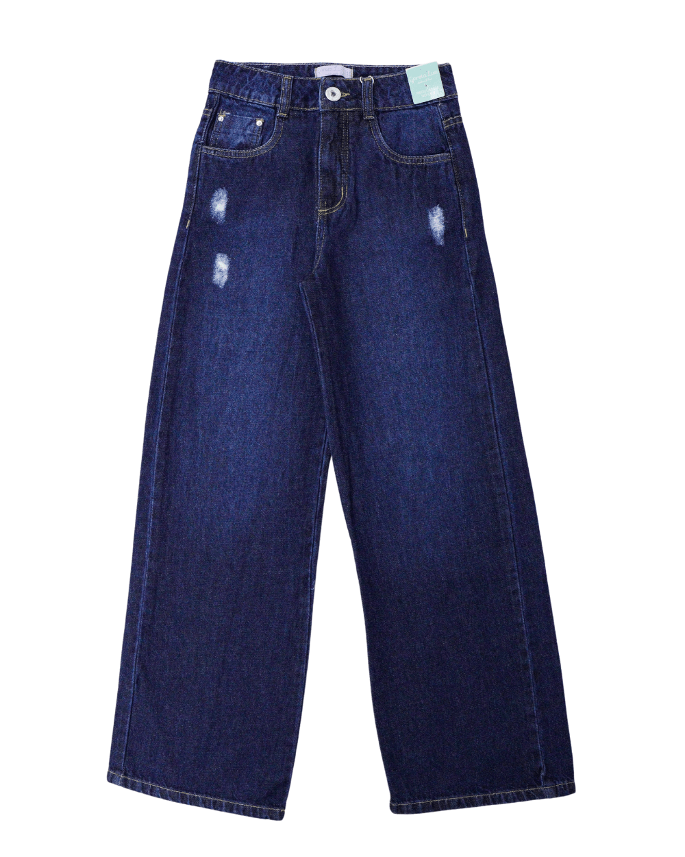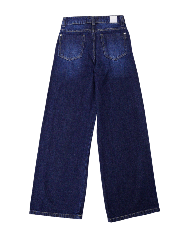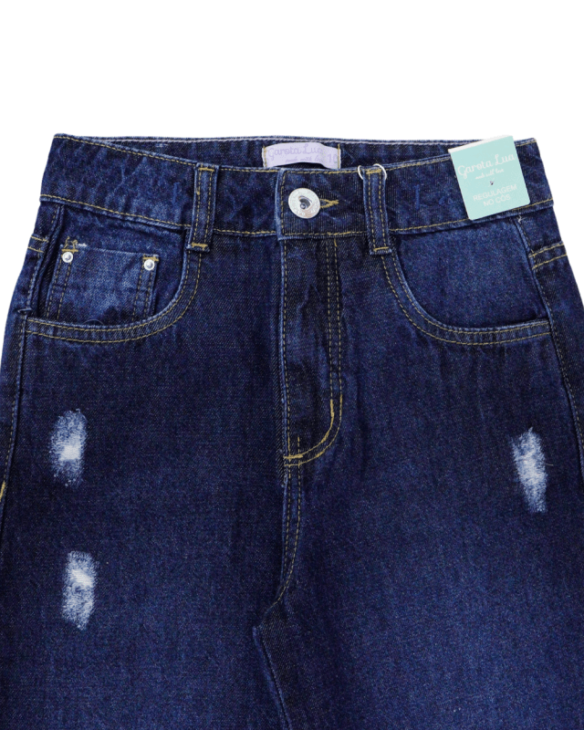 Calça Feminina, Garota Lua, wide leg, detalhes desfiados regulagem no cós lavagem clara e barra simples.