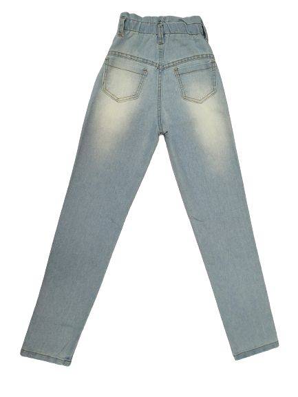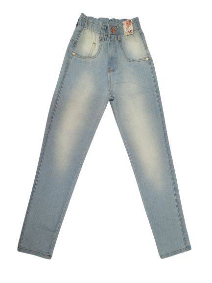 Calça jeans feminina infantil, lavagem clara, bolso frontal e traseiro ,cós elástico com regulagem e passante para cinto fecho botão e zíper. Barra simples.