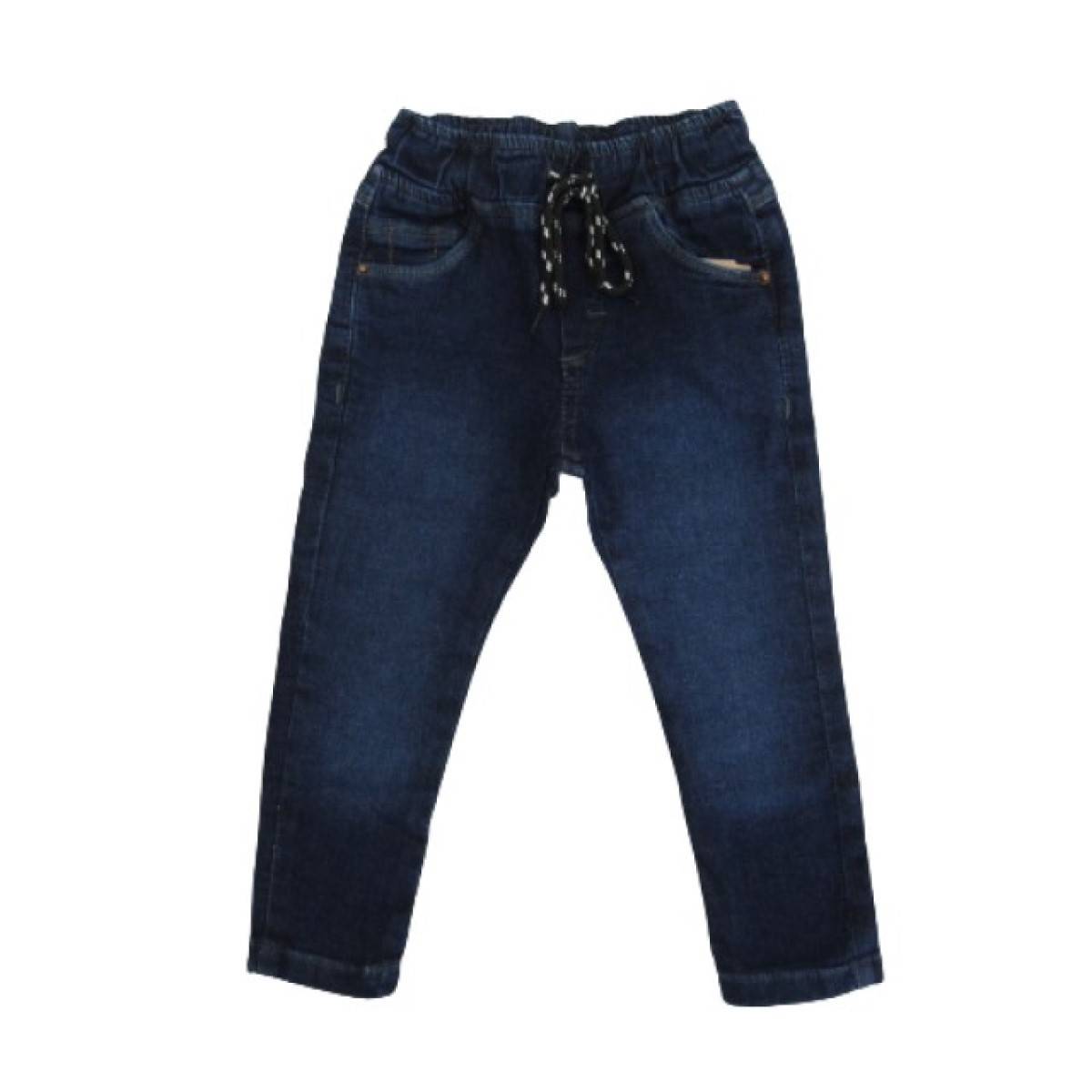 Calça jeans jeans masculina infantil, lavagem escura, bolso frontal fake e bolso traseiro ,cós com elástico , Barra com acabamento simples.