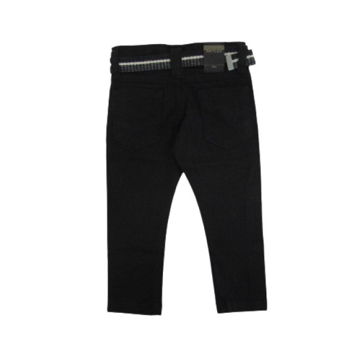 Calça bebê sarja ,na cor preta ,com passantes para cinto, regulagem interna no cós, com fechamento por botão. Acompanha cinto.