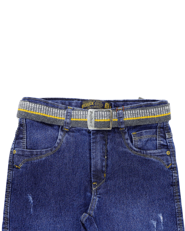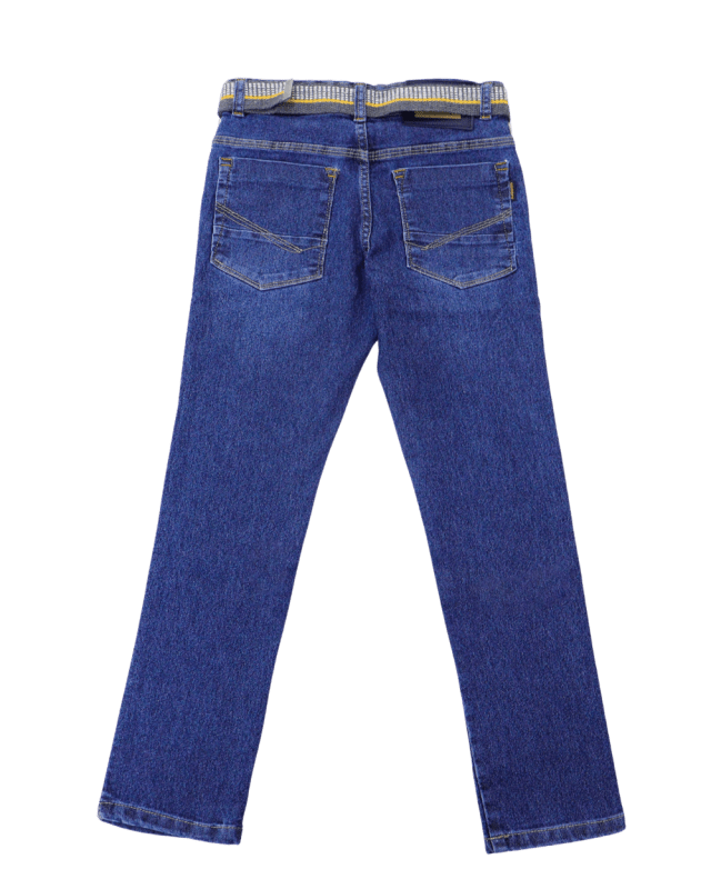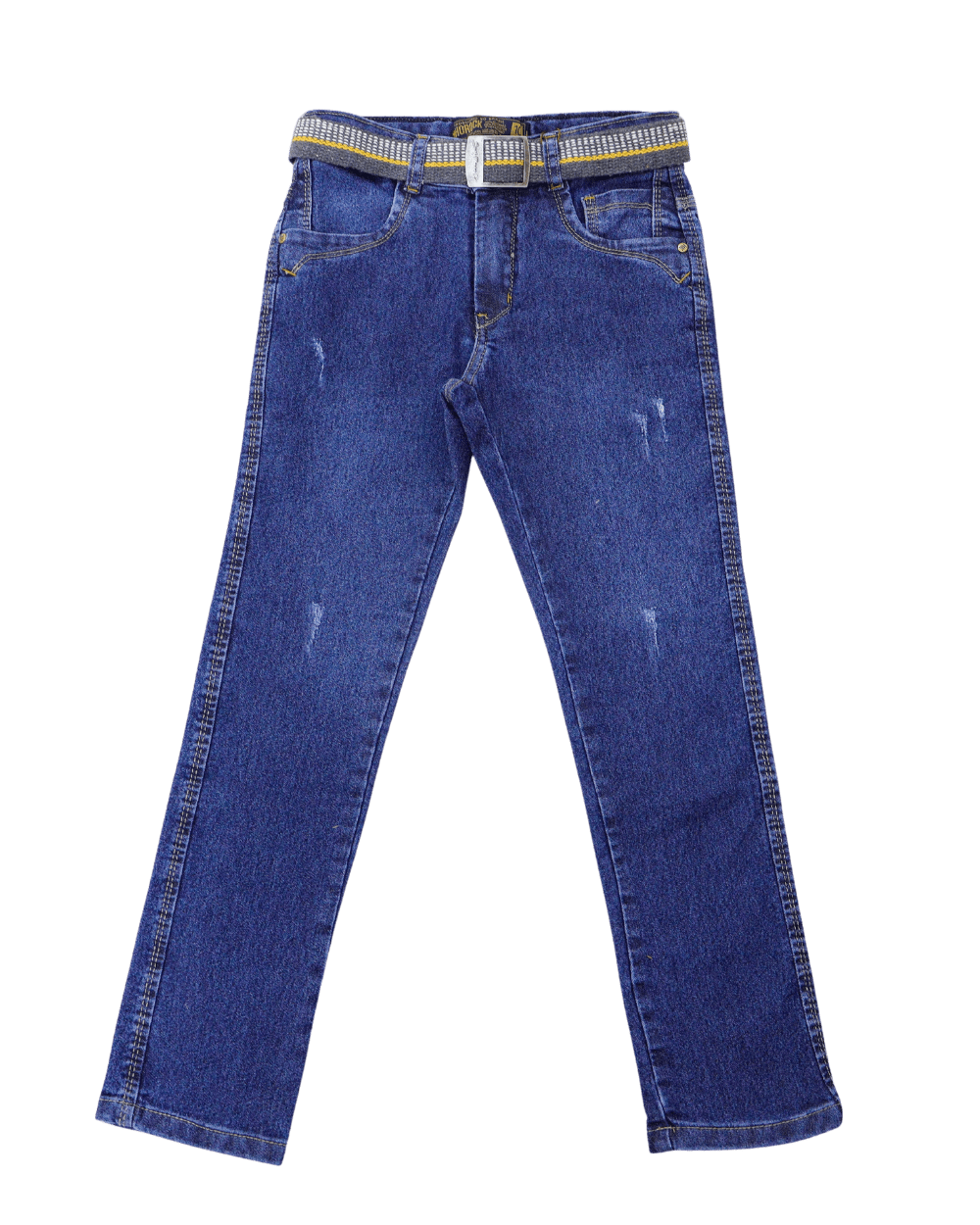 Calça jeans ,com bolsos frontal e traseiro, fecho por botão e zíper, cós com regulagem e passante para cinto.