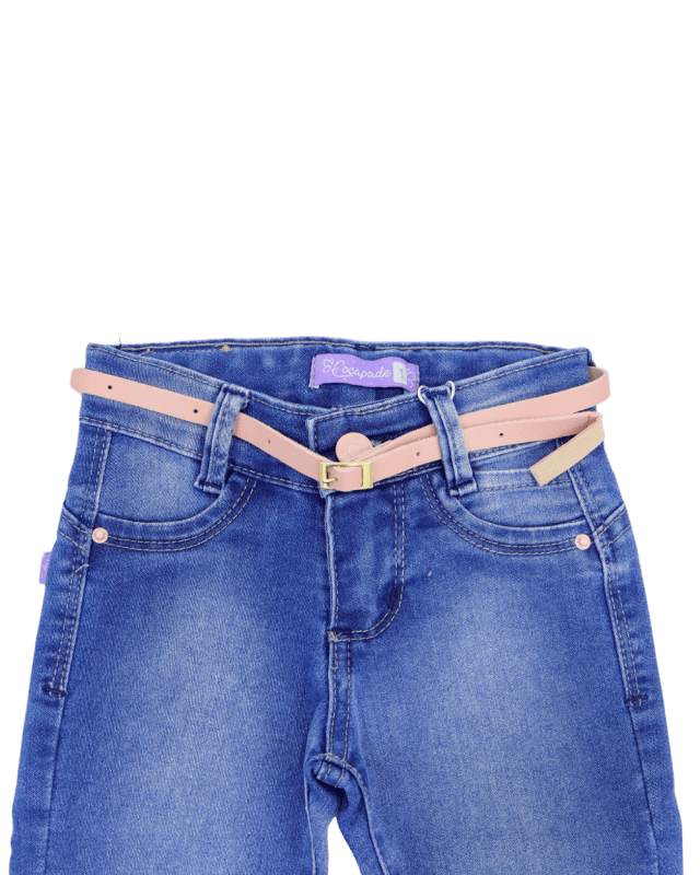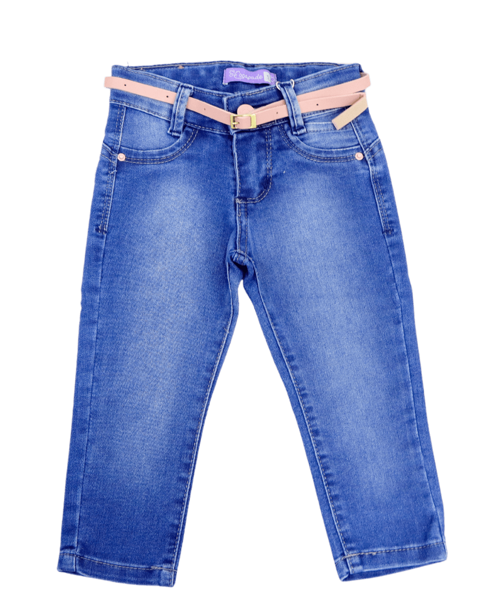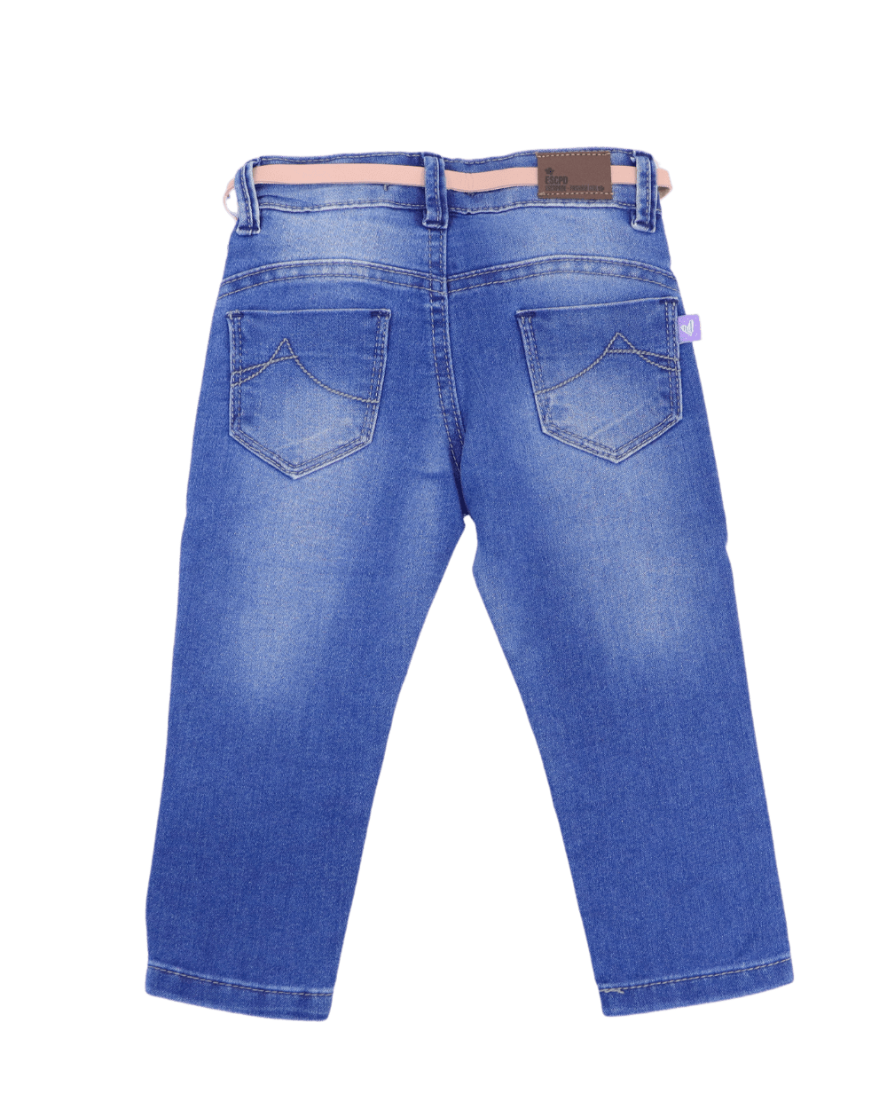 Calça jeans ,com bolsos frontal e traseiro, fecho por botão e zíper, cós com regulagem e passante para cinto.