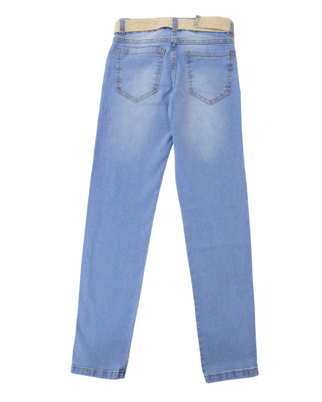 Calça jeans ,com bolsos frontal e traseiro, fecho por botão e zíper, cós com regulagem e passante para cinto.