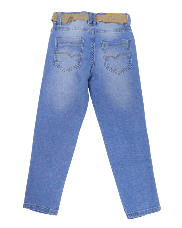Calça jeans ,com bolsos frontal e traseiro, fecho por botão e zíper, cós com regulagem e passante para cinto.