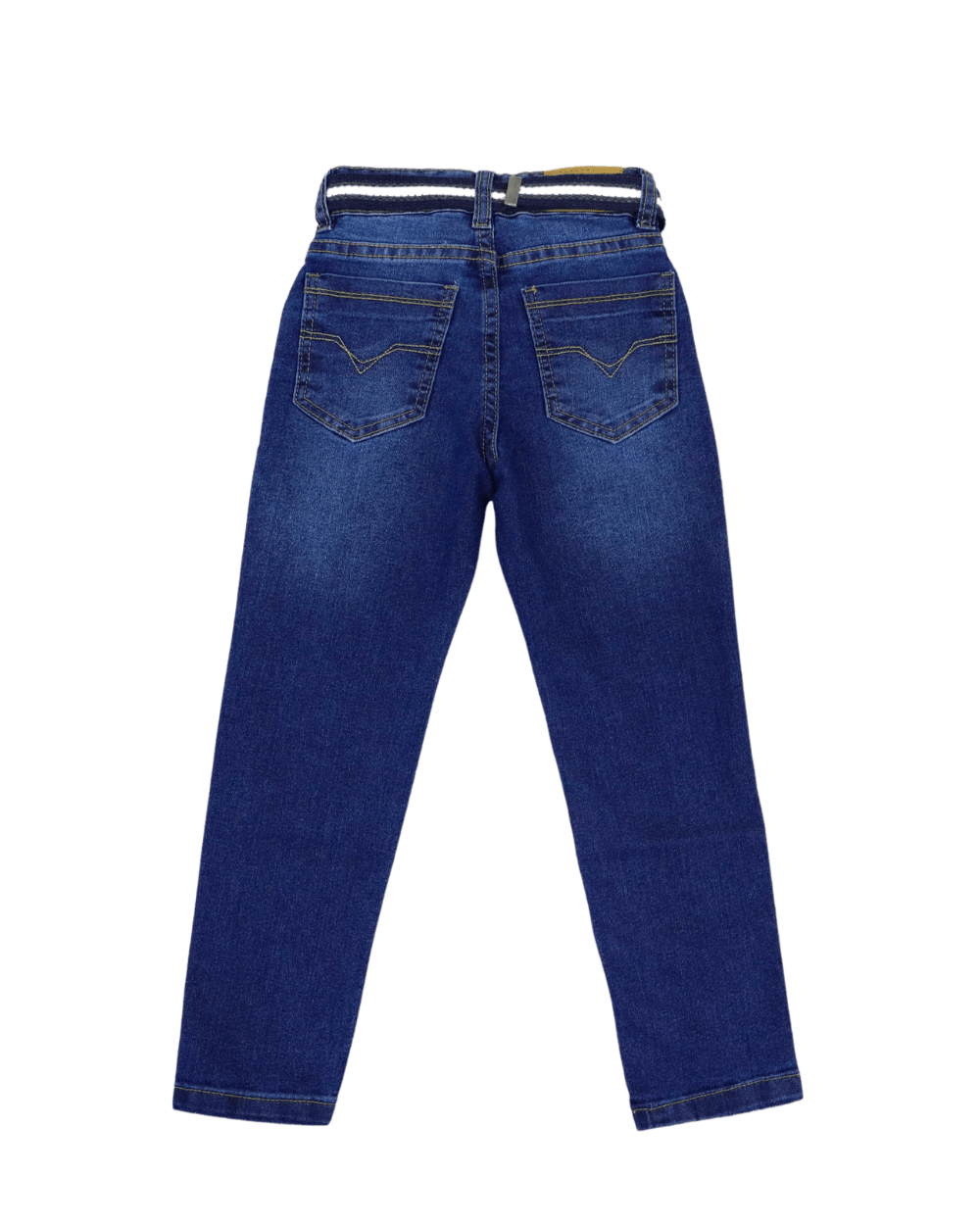 Calça jeans ,com bolsos frontal e traseiro, fecho por botão e zíper, cós com regulagem e passante para cinto.