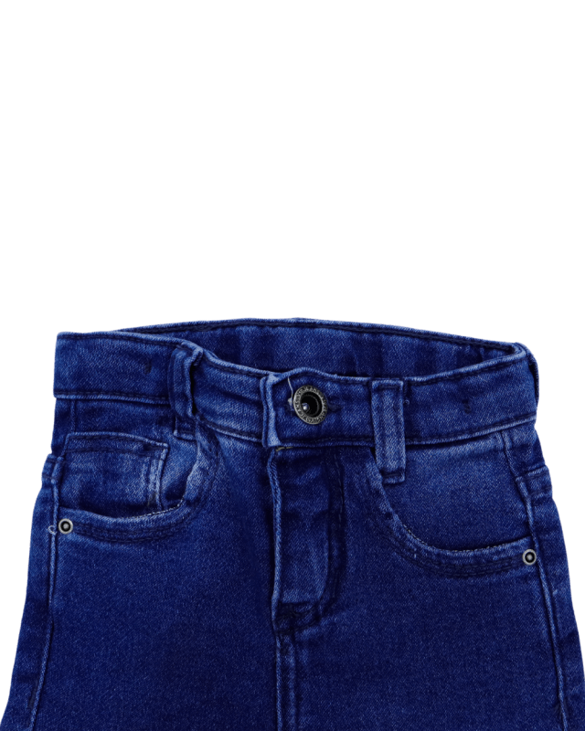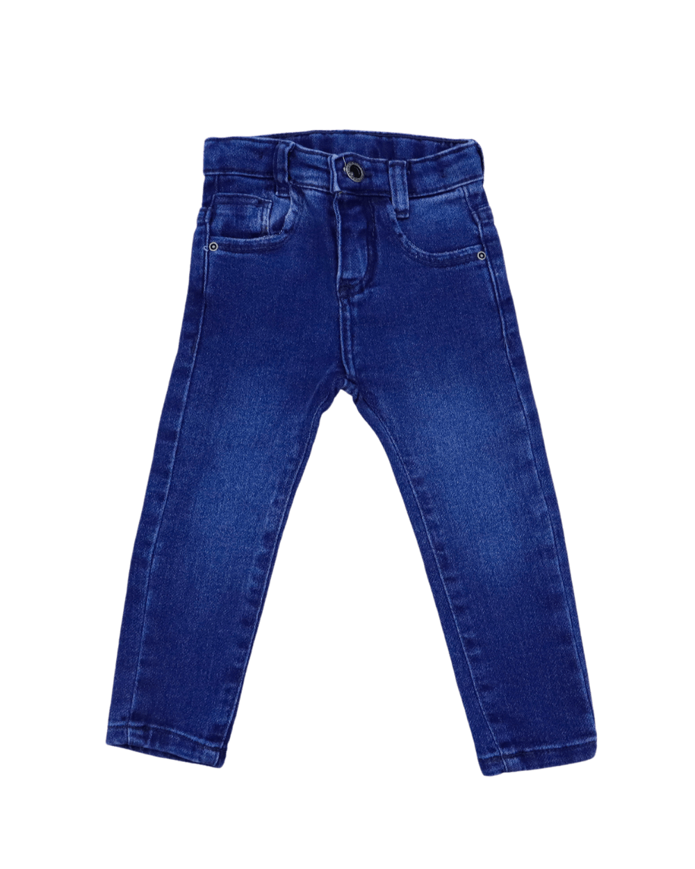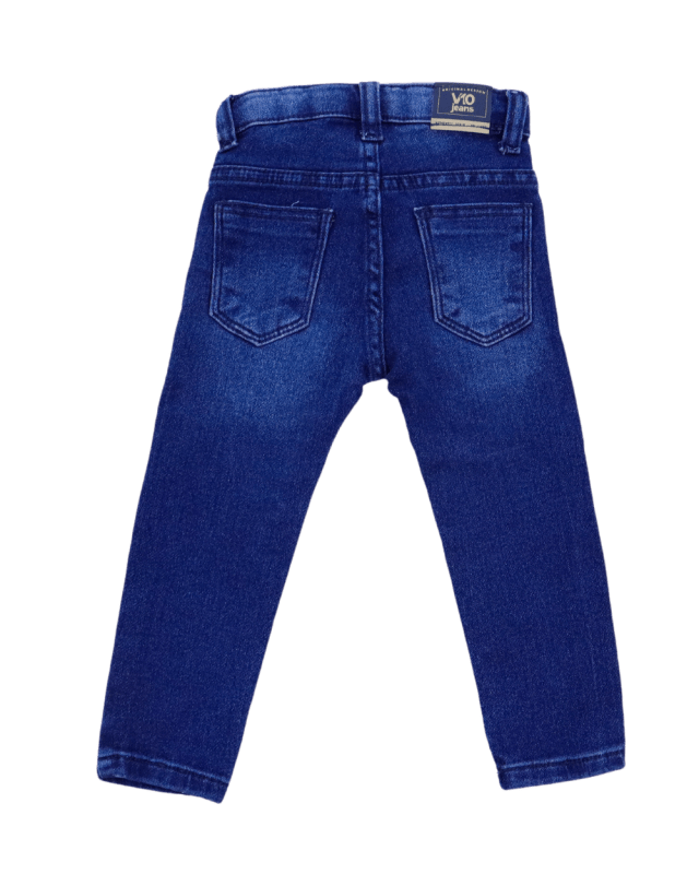 Calça jeans ,com bolsos frontal e traseiro, fecho por botão e zíper, cós com regulagem e passante para cinto.
