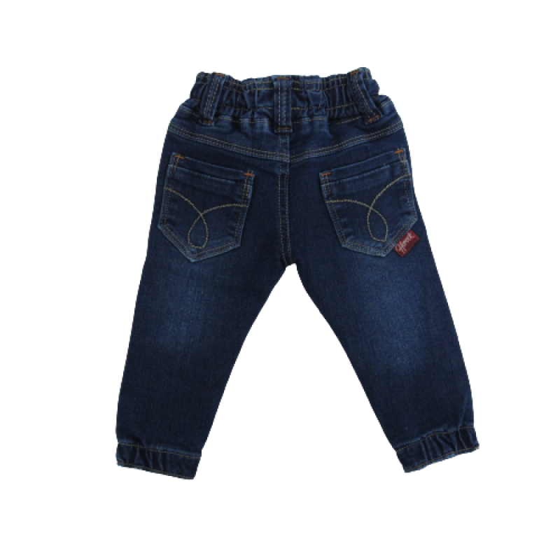 CALÇA JEANS JOGGER, CÓS E PUNHO COM ELÁSTICO. LAVAGEM ESCURA.