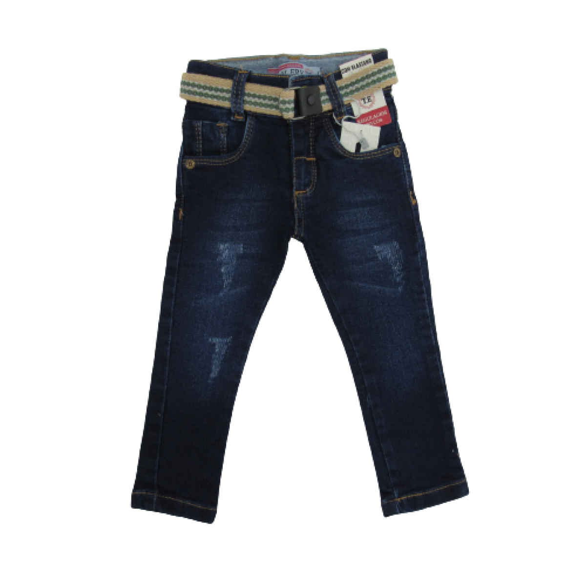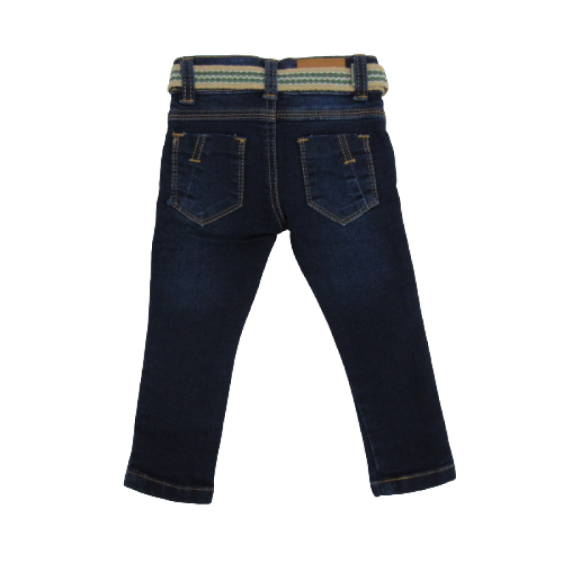 CALÇA JEANS ,BOLSOS FRONTAL E TRASEIRO, CÓS COM REGULAGEM E CINTO ,LAVAGEM ESCURA.