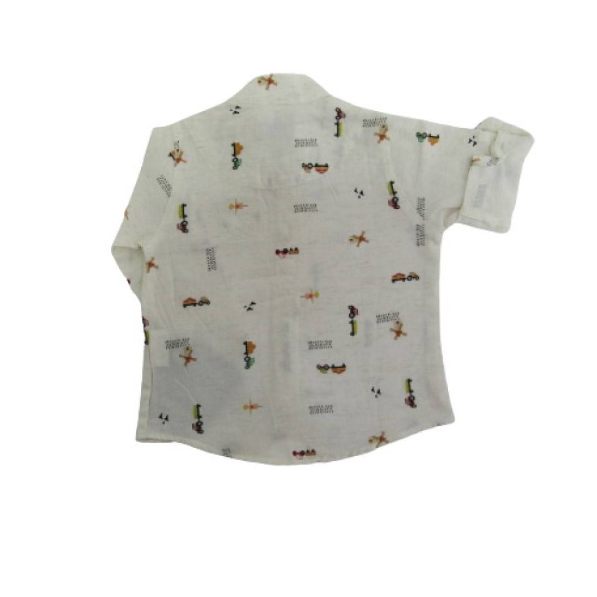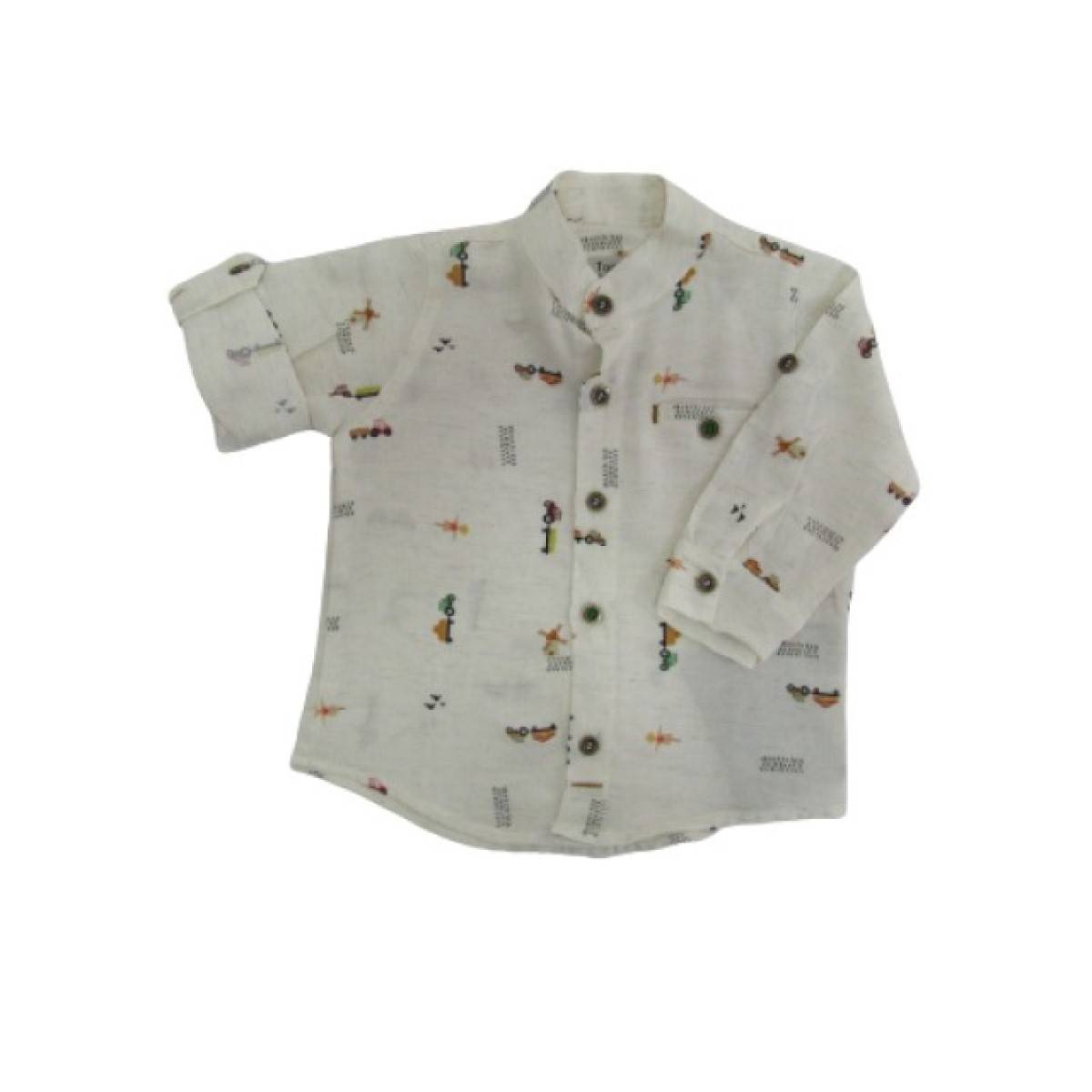 Camisa infantil masculina manga longa, vira 3/4 .Estampa carretinha, bolso frontal fake , fechamento por botões. Cor: Bege