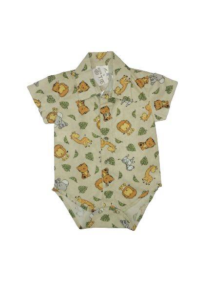 Camisa masculina manga curta infantil, estampa do safari, fechamento por botões frontal.