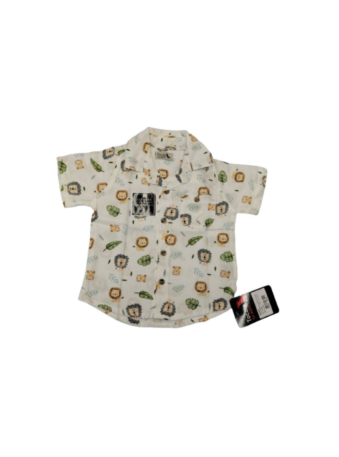 Camisa social manga curta, estampada (Leão) ,fechamento por botões. , gola polo, detalhe frontal bordado branco.