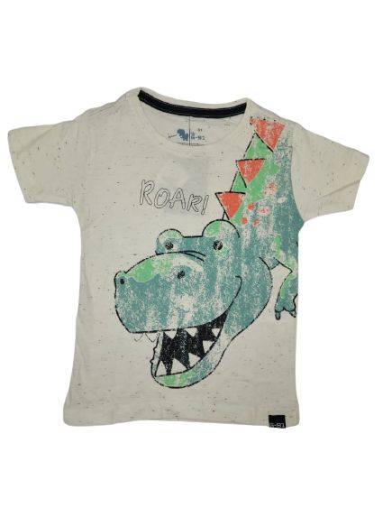 Camiseta masculina infantil manga curta, gola careca, estampa de dinossauro. Se ajusta facilmente ao corpo.