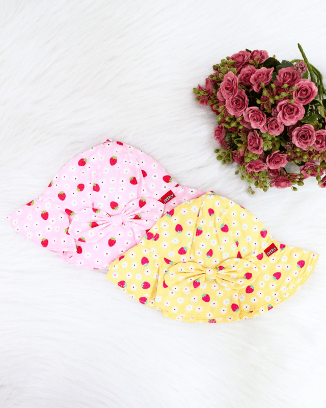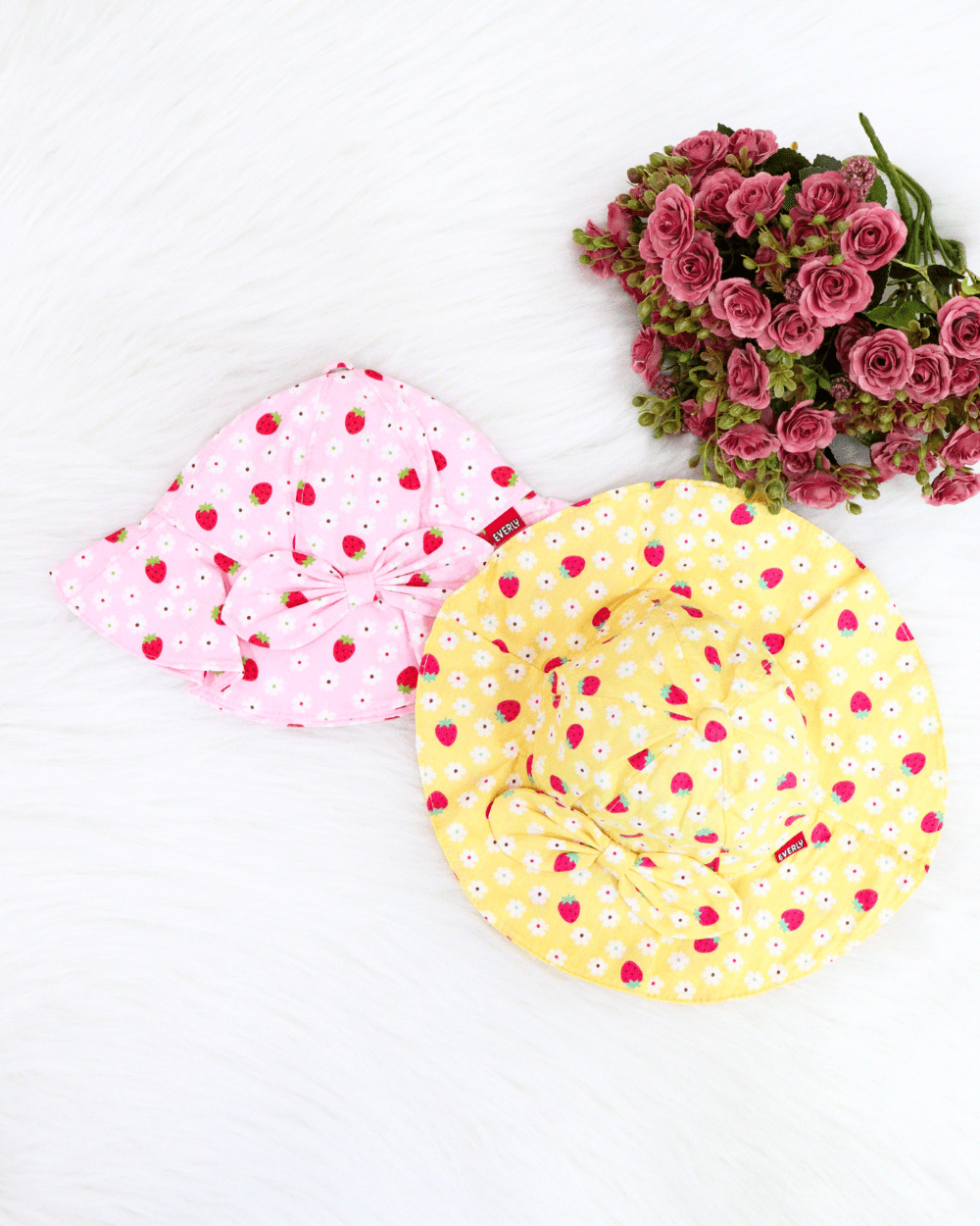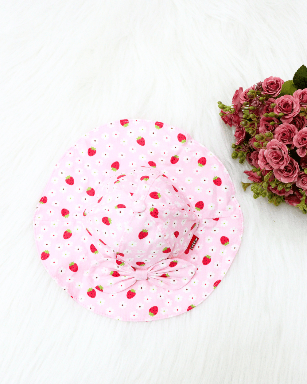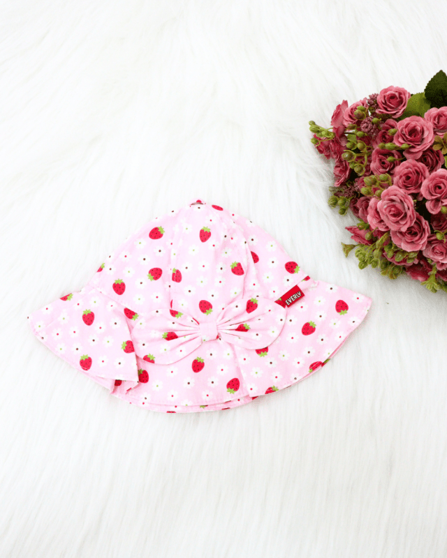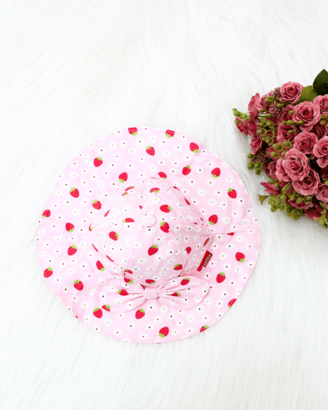 Chapéu feminino everly em estampa de Morango Segue tamanhos: P: 01 a 02 anos. M: 02 a 03 anos. G: 03 a 04 anos. 100% Algodão