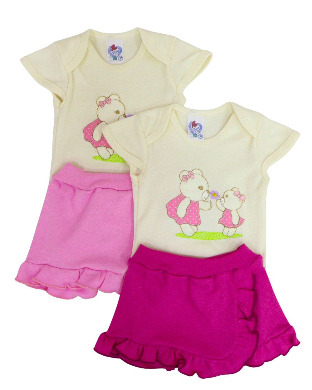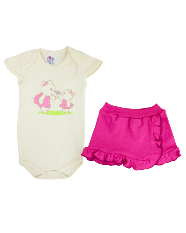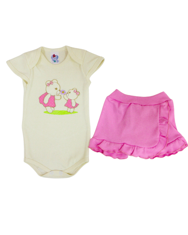 Conjunto baby amore composto por 1 body manga curta bordado e uma saia lisa com a cintura em elástico para maior conforto do bebê. Composição: 100% Algodão