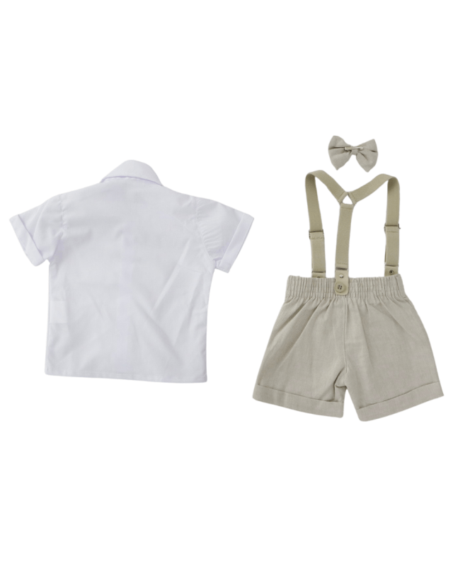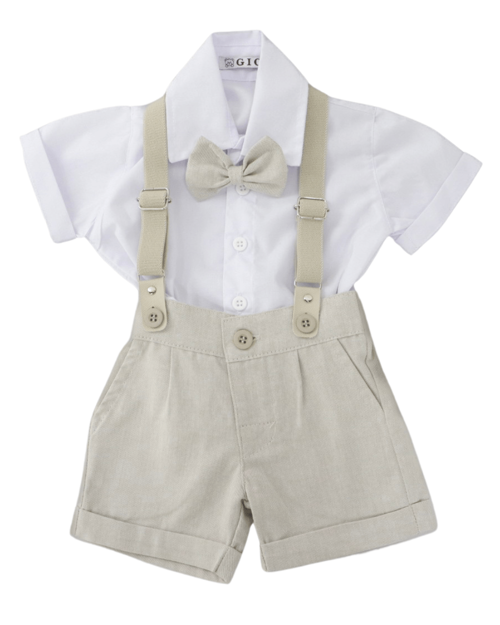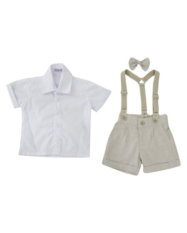 Conjunto curto masculino GIC, o modelo acompanha 1 Suspensório, 1 camisa manga curta, 1 bermuda e 1 gravata borboletacom com fechamento em presília..
