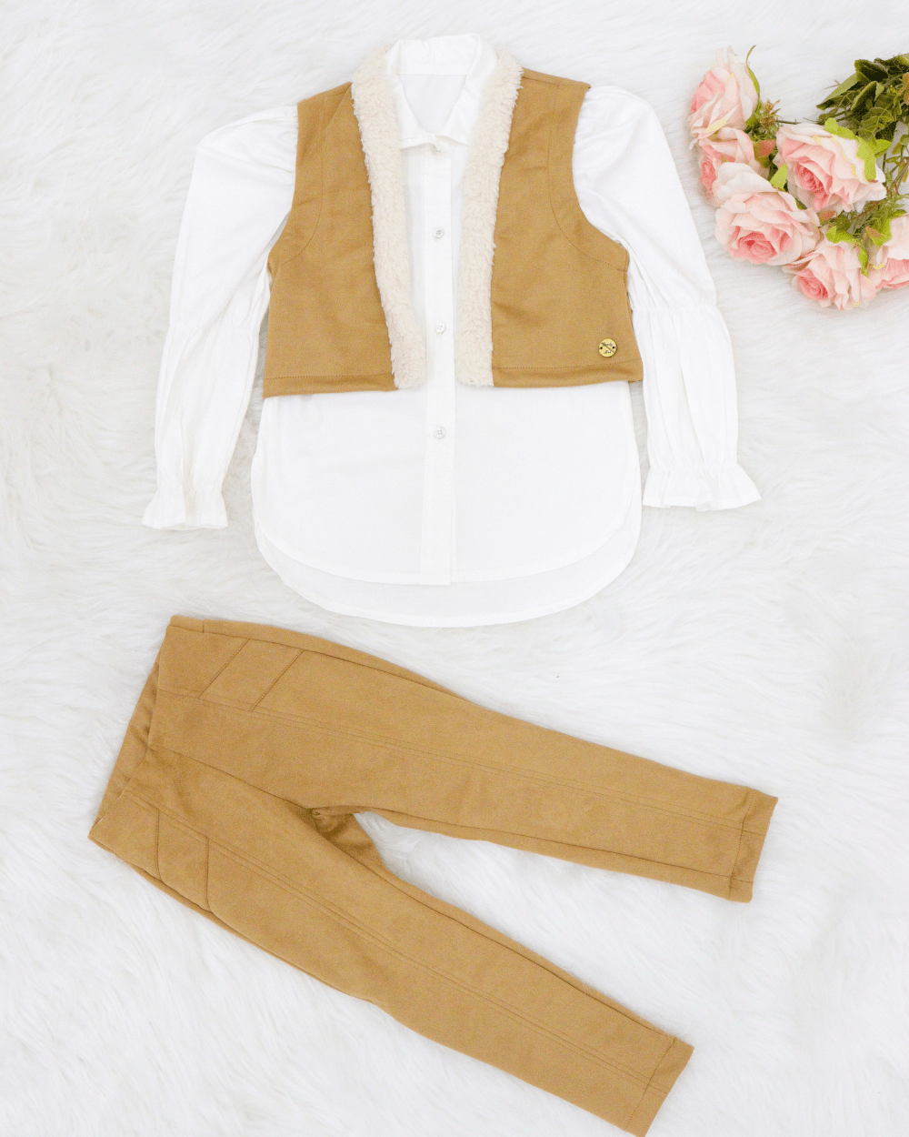 Composição:Colete: Sherpa: 100% Poliéster Suede: 96% Poliéster 4% Elastano Camisa: Tricoline: 97% Algodão 3% Elastano. Calça: Suede 96% Poliéster 4% Elastano