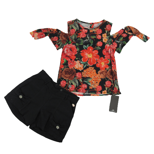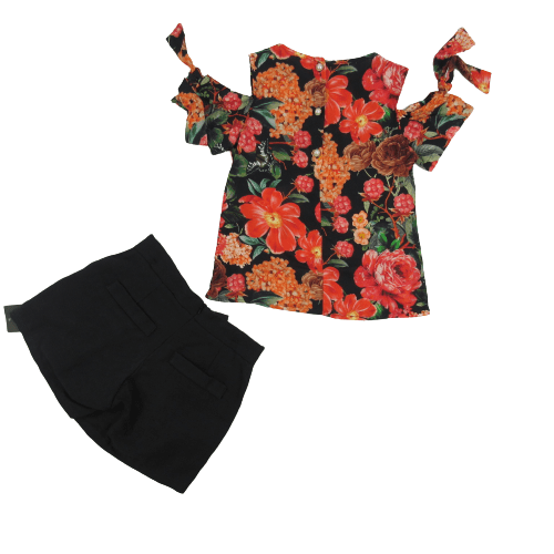 CONJUNTO CURTA. BLUSA ESTAMPA FLORAL ,SHORTS LISO COM BOLSOS.