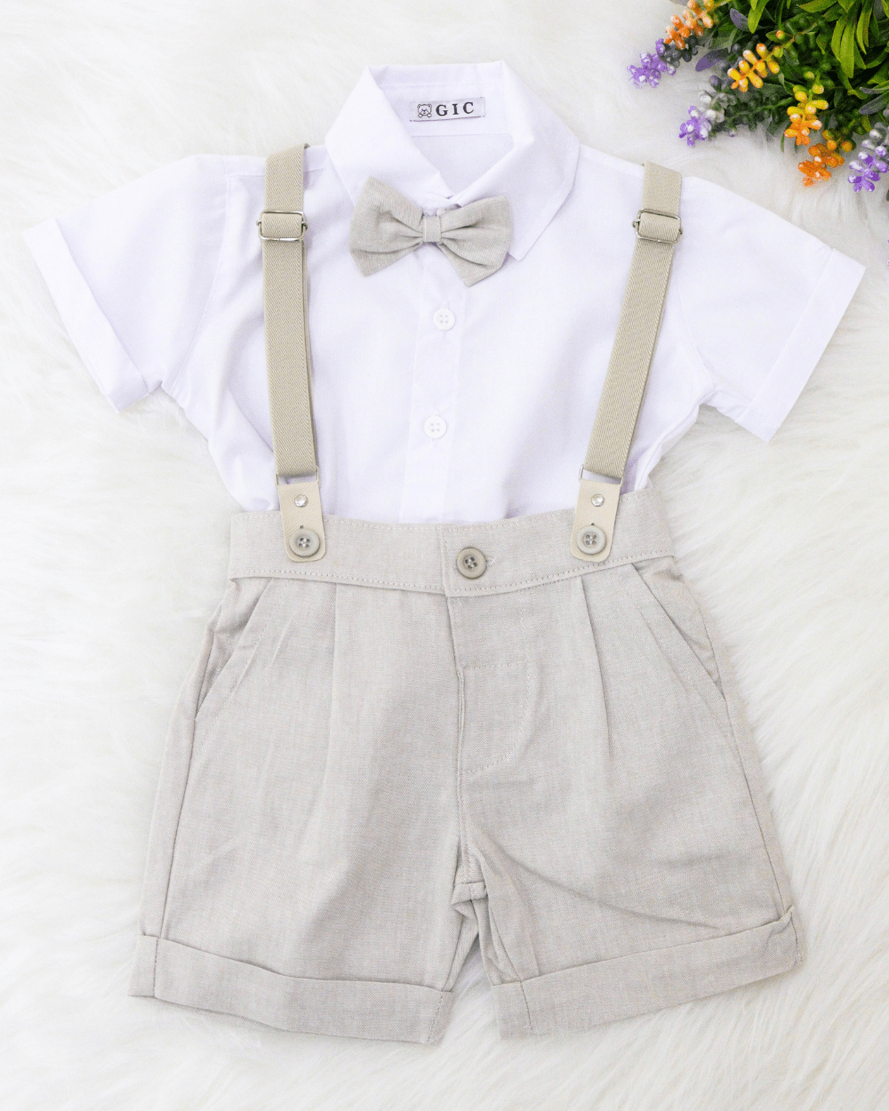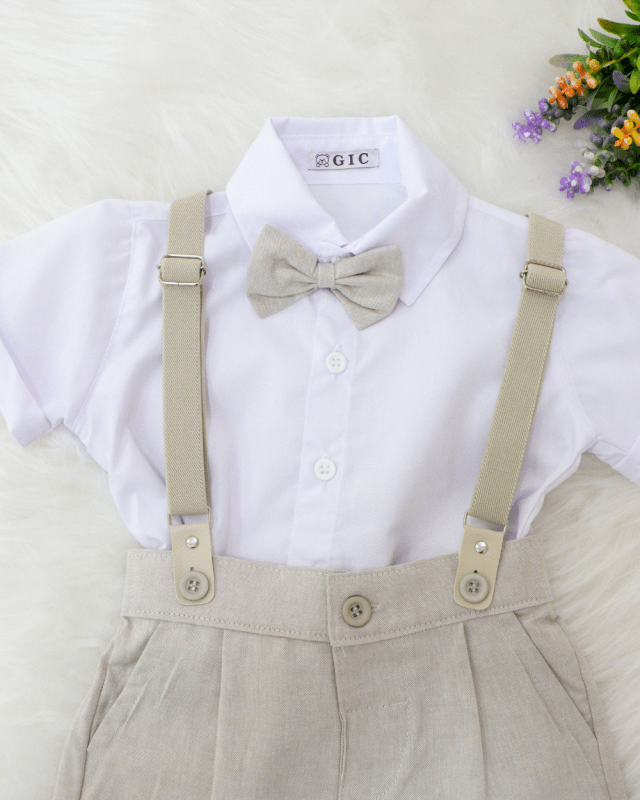 Conjunto social longo infantil, branco e bege. Composto por: 1 camisa social manga longa lisa,1 suspensório liso, elástico.1 calça, com bolsos e 1 cinto, elástico traseiro.