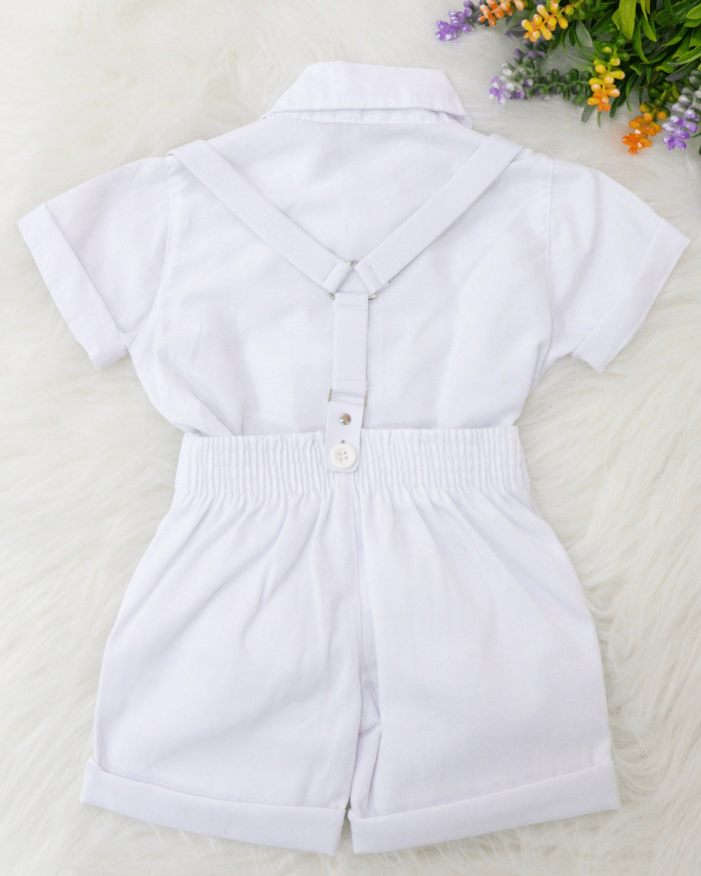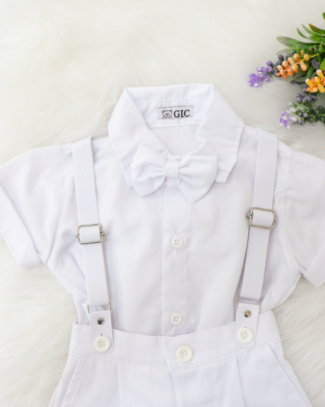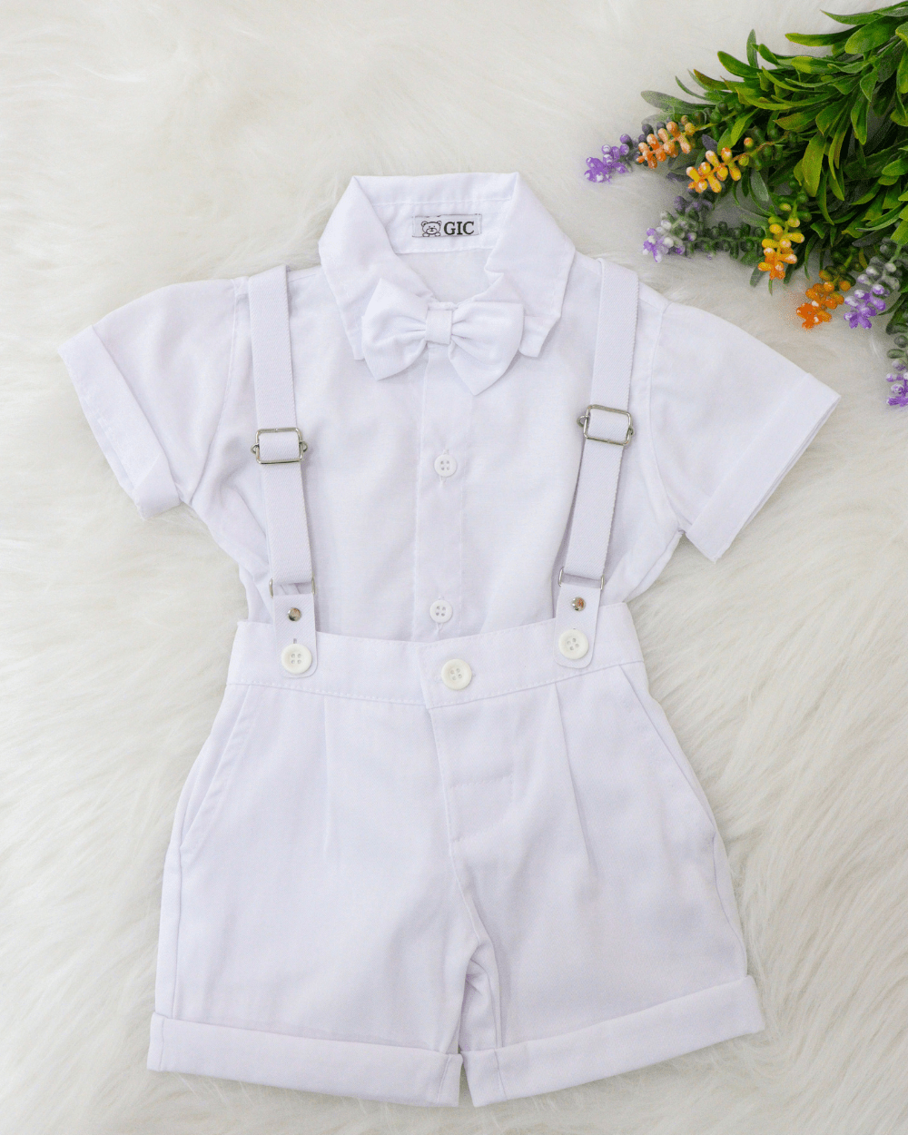 Conjunto curto masculino GIC, o modelo acompanha 1 Suspensório, 1 camisa manga curta, 1 bermuda e 1 gravata borboleta..