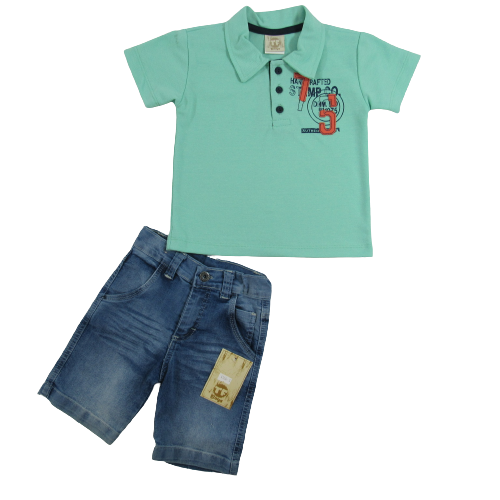 Conjunto curto masculino camisa lisa bordada. Bermuda jeans com bolso frontal e nas costas.