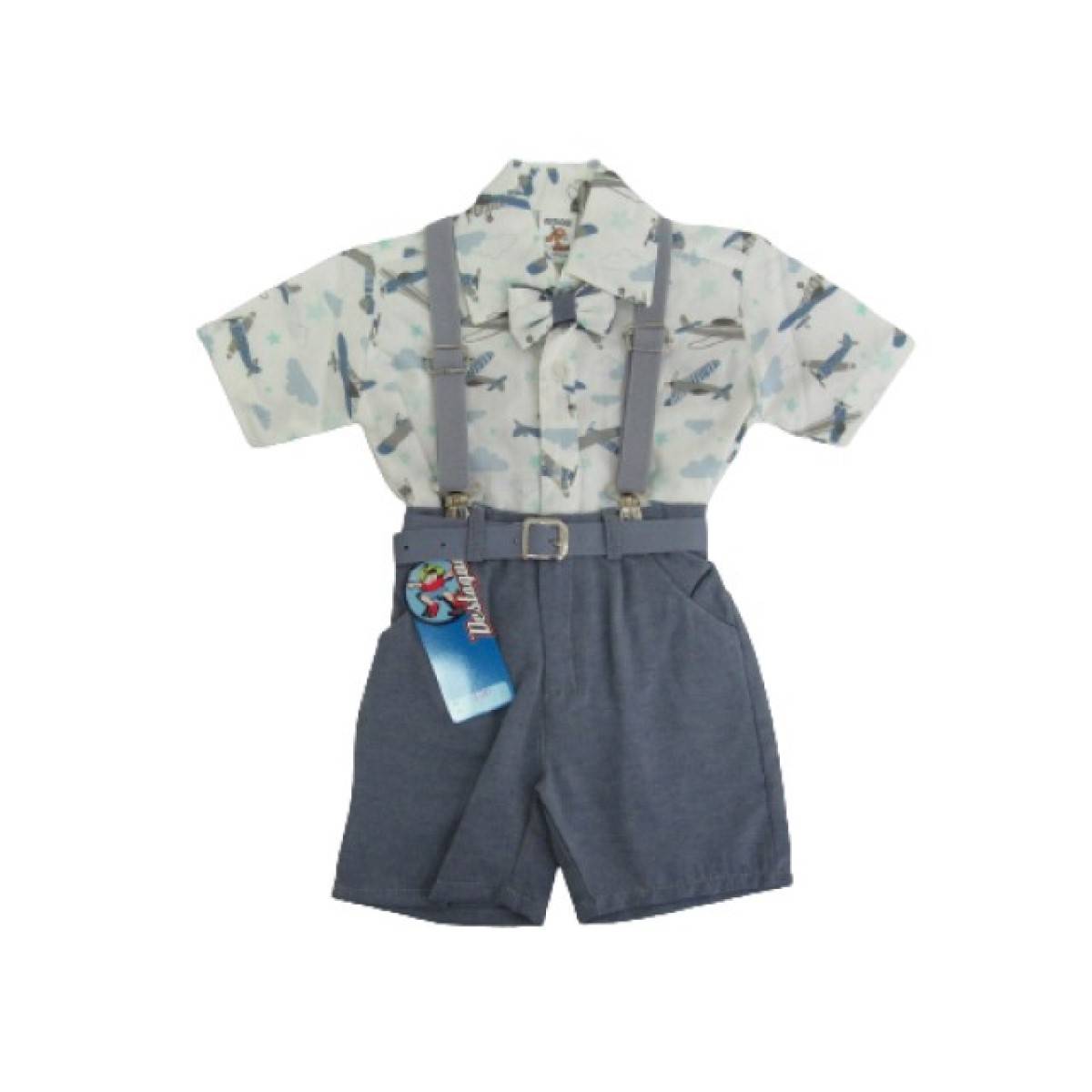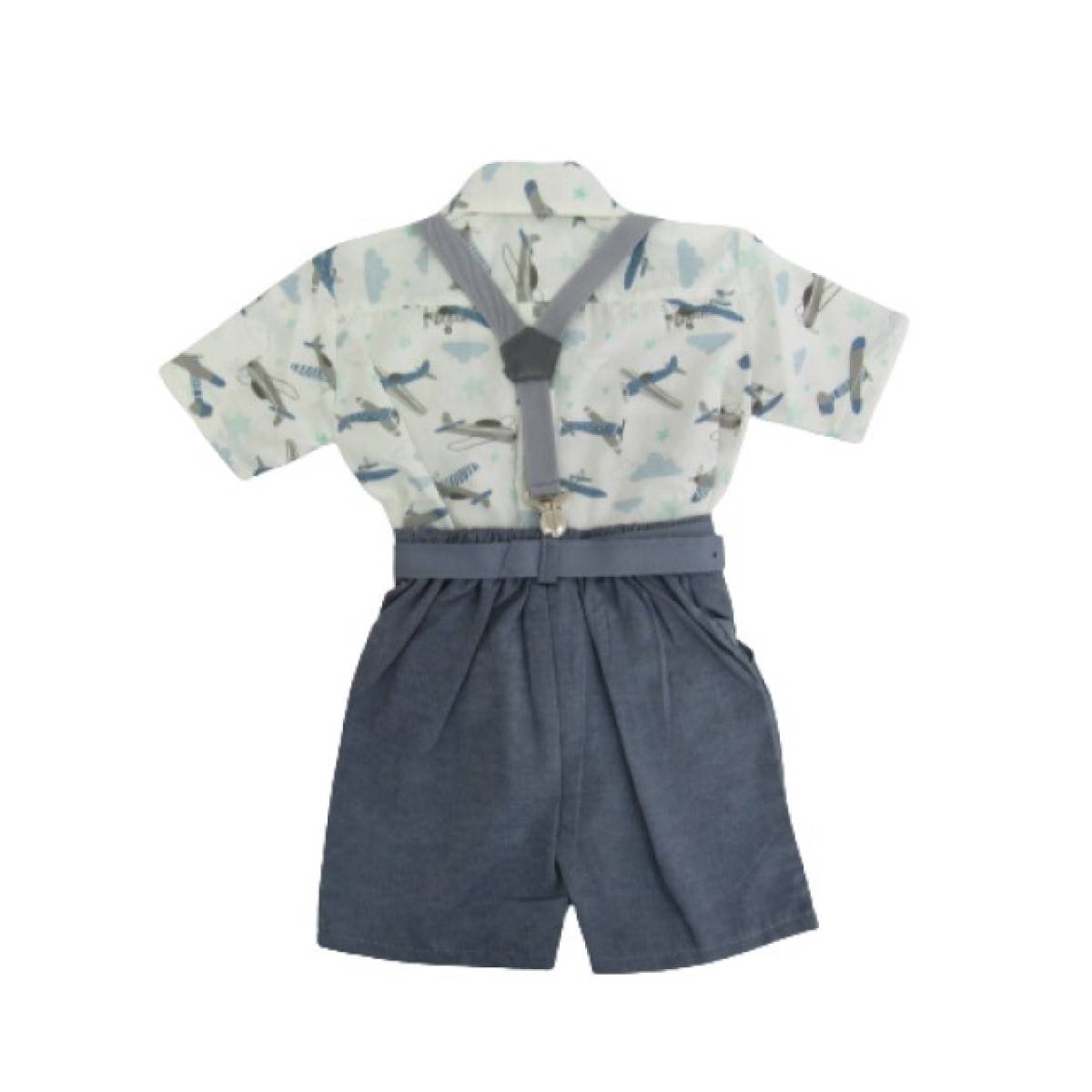 Conjunto social curto infantil, azul. Composto por: 1 camisa social manga curta estampa Aviões.1 bermuda azul lisa,com bolsos,cinto. Cós com elástico traseiro. Barra acabamento simples.