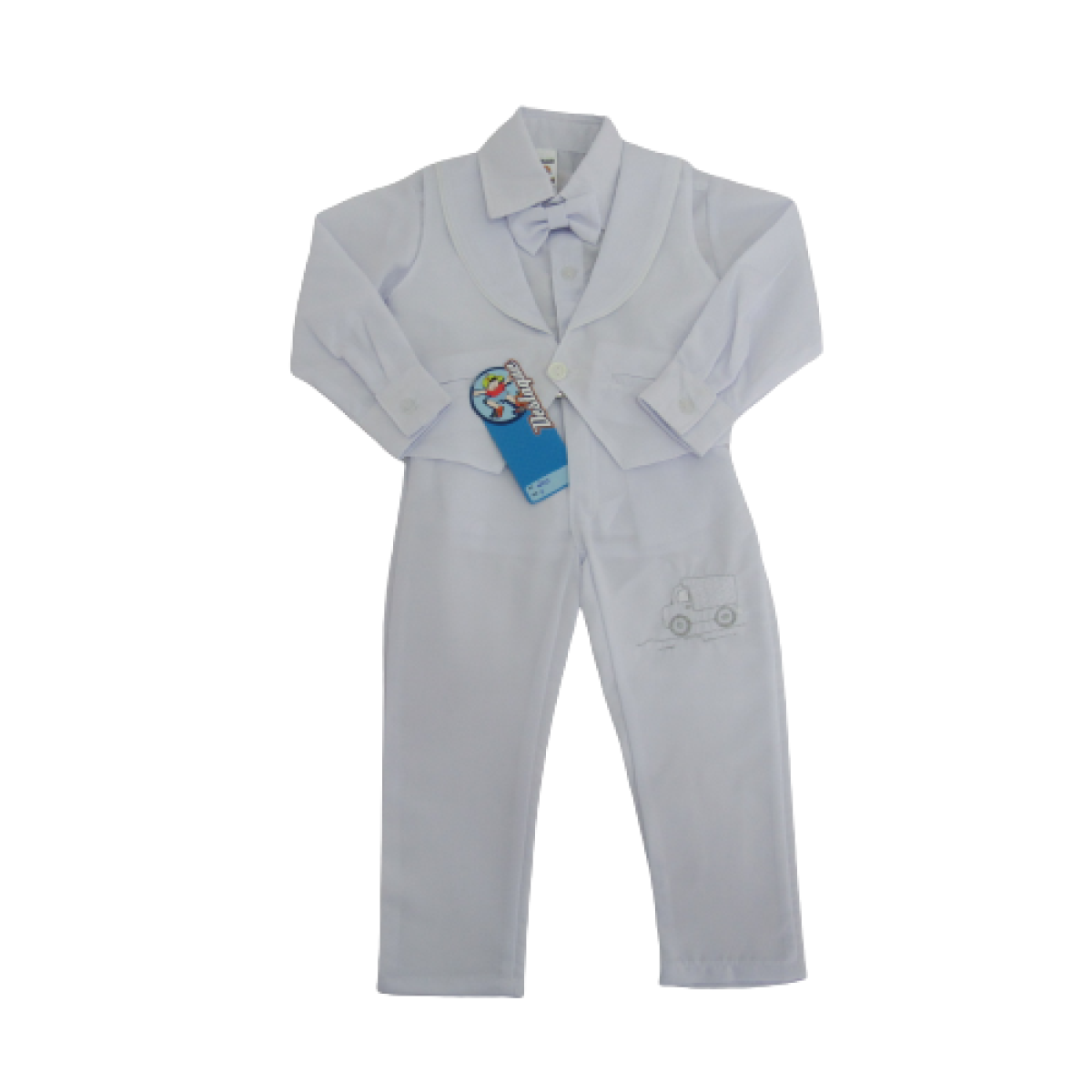 CONJUNTO SOCIAL LONGO, COMPOSTO POR: CAMISA MANGA LONGA LISA, COLETE, CALÇA E GRAVATA BORBOLETA. COR: BRANCO