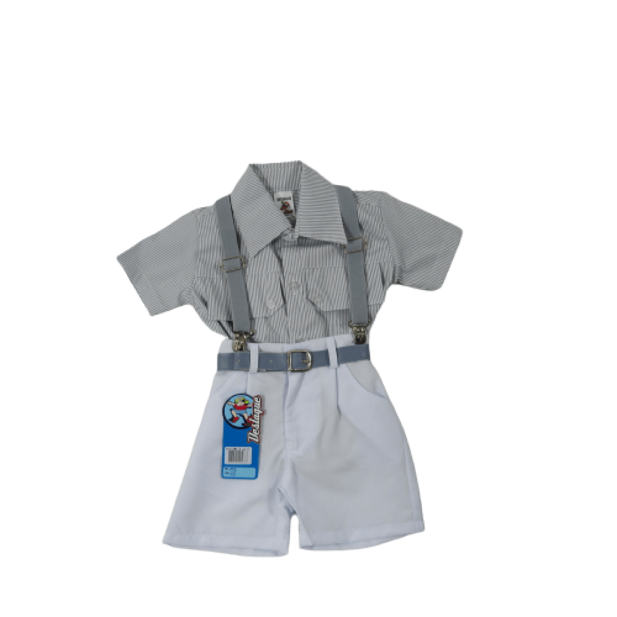 Conjunto social curto infantil. Composto por: 1 camisa social manga curta listrada .1 bermuda cor branca, com bolsos,cinto. Cós com elástico traseiro. Barra acabamento simples.