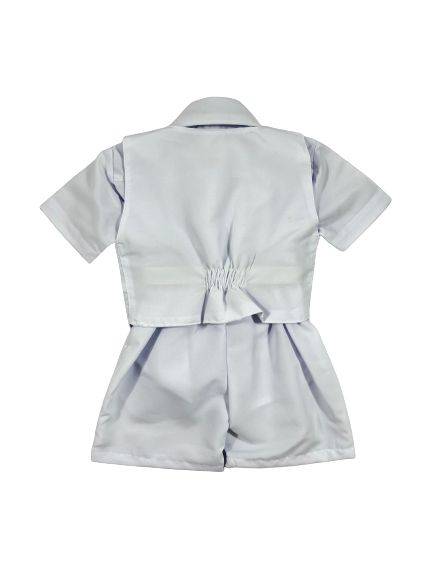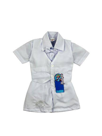 CONJUNTO SOCIAL CURTO, COLETE COM BOLSOS FALSOS,COM GRAVATA BORBOLETA, SUSPENSÓRIO E CINTO. CAMISA SOCIAL MANGA CURTA LISA E BERMUDA SOCIAL.