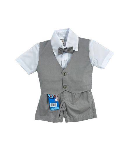 CONJUNTO SOCIAL CURTO, COLETE COM BOLSOS FALSOS,COM GRAVATA BORBOLETA, SUSPENSÓRIO E CINTO. CAMISA SOCIAL MANGA CURTA LISA E BERMUDA SOCIAL.