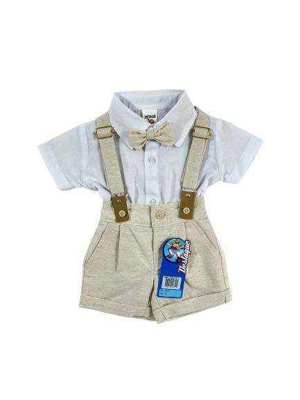 Conjunto social curto infantil, branco com bege Composto por: 1 camisa social manga curta lisa.1 bermuda sarja color bege com bolsos, fechamento botão e zíper. Cós com regulagem, elástico traseiro ajustável.