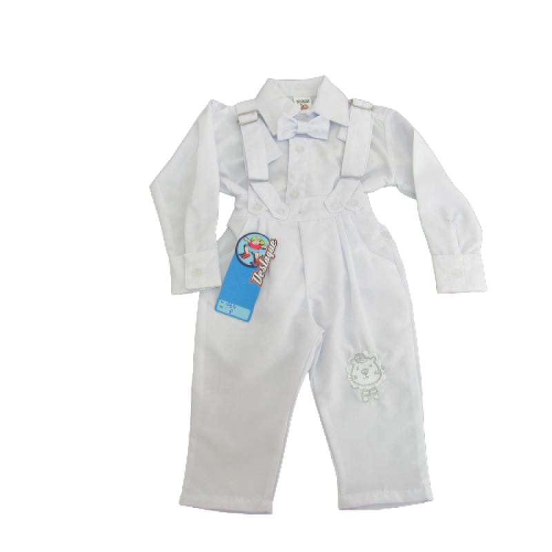 CONJUNTO SOCIAL LONGO, COM SUSPENSÓRIO, GRAVATA BORBOLETA. CALÇA COM ELÁSTICO NO CÓS. COR: BRANCO