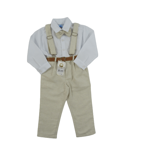 Conjunto social longo infantil palha. Composto por: 1 camisa social manga longa lisa ,1 calça lisa bege,1 suspensório, 1 gravata borboleta, 1 cinto. Com bolsos, fecho botão. Cós com regulagem ,elástico traseiro ajustável.
