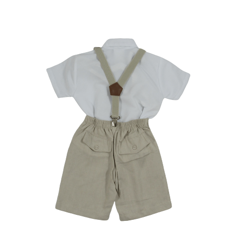 Conjunto social curto infantil, branco. Composto por: 1 camisa social manga curta lisa.1 bermuda branca, com bolsos.