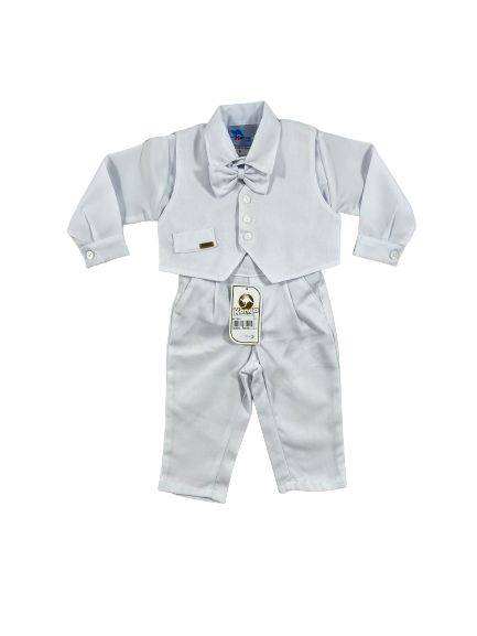 Conjunto social longo infantil, branco. Composto por: 1 camisa social manga longa lisa,1 colete liso bolso fake.1 calça com bolsos, elástico traseiro e 1 gravata borboleta.